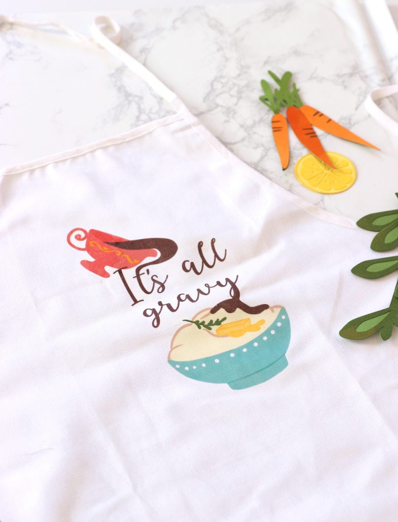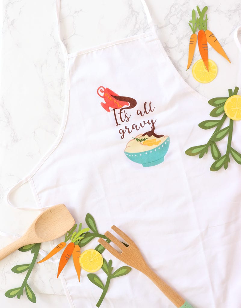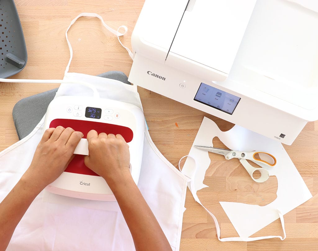 Place the design onto your apron and use an iron or the Cricut Easy Press to secure it into place. Be sure to use a piece of scrap fabric as a barrier between the iron and the design. You do not want to make direct contact between the two.
