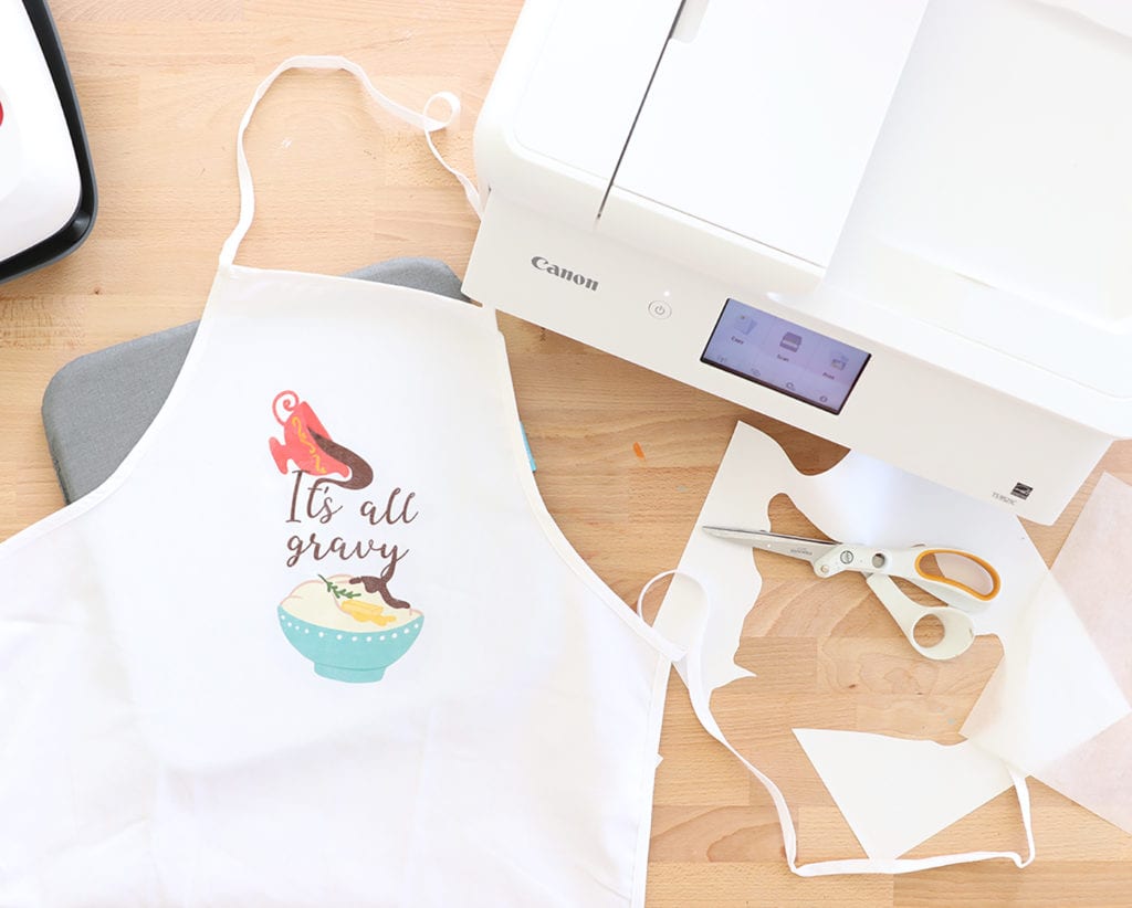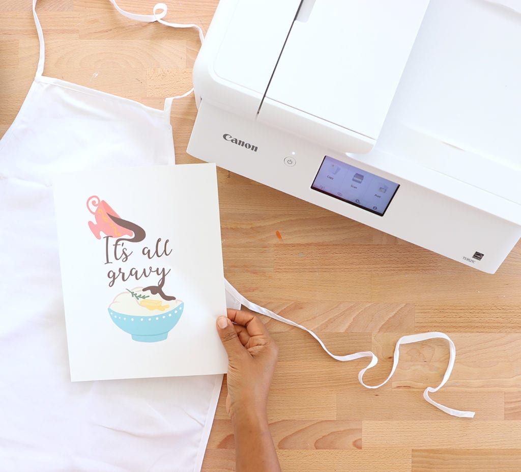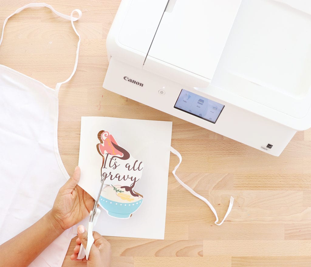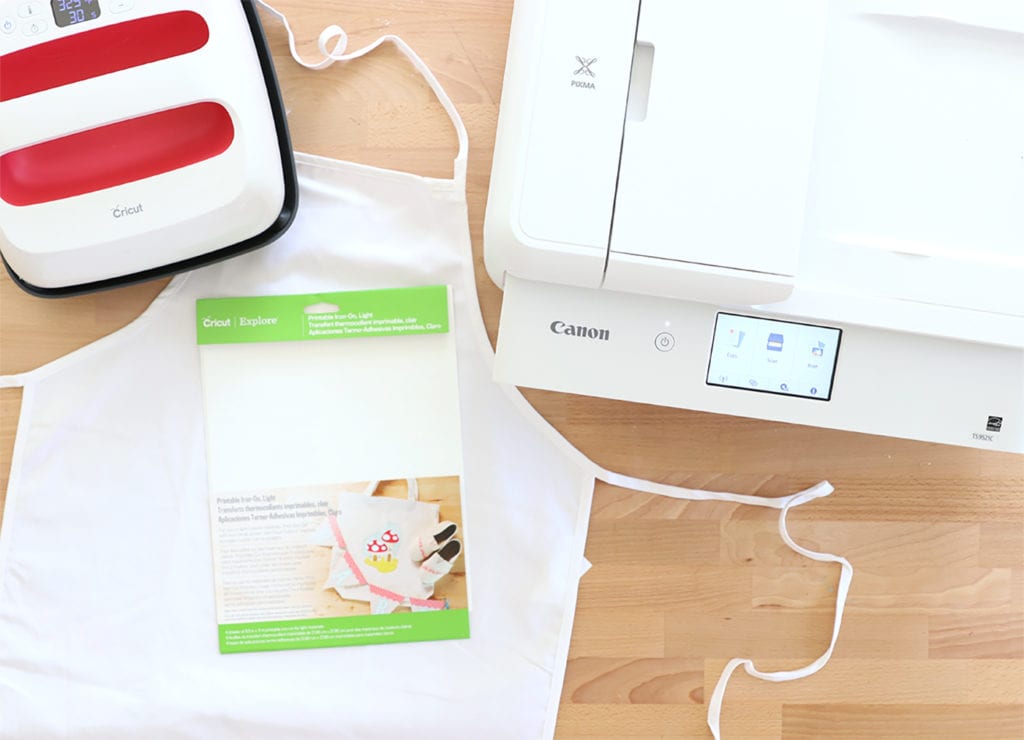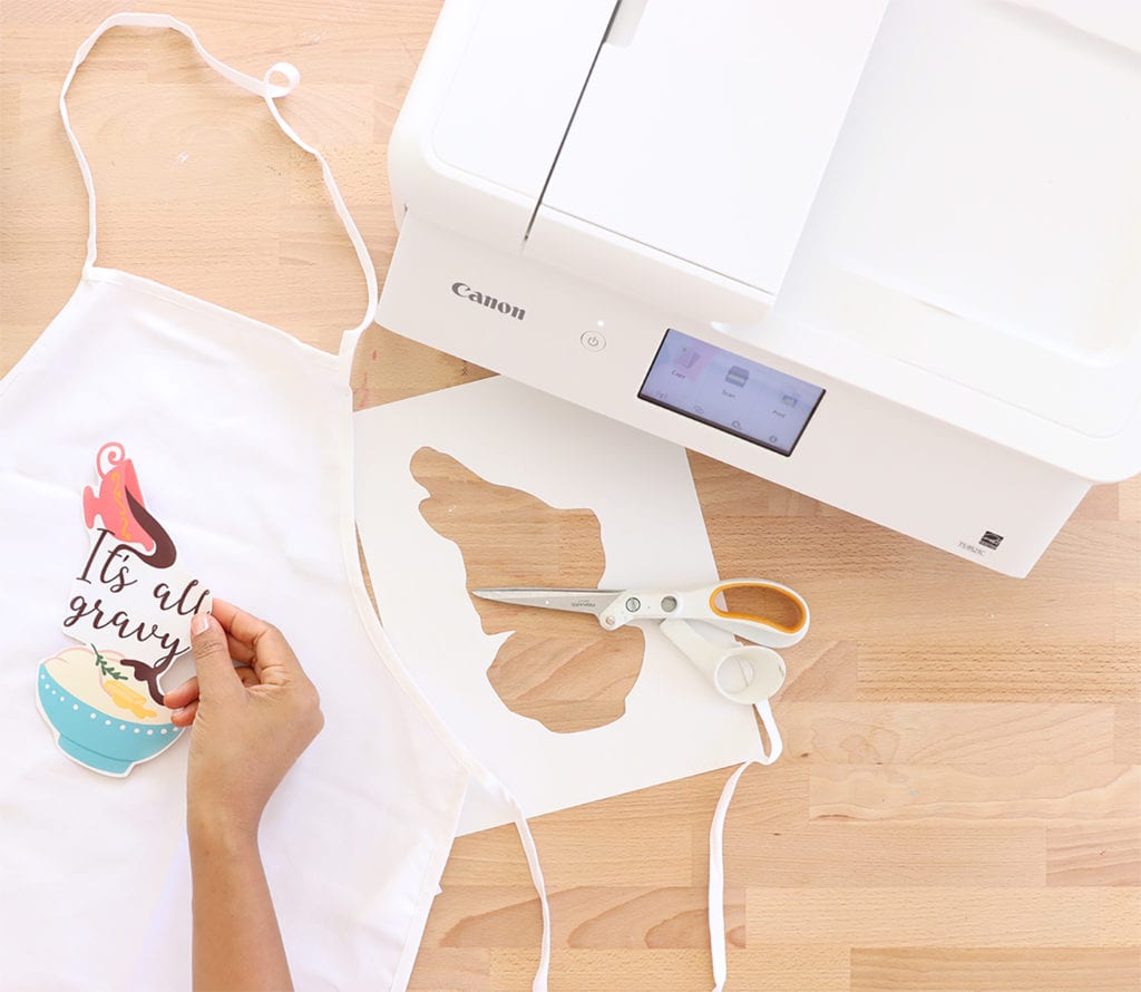 The Canon PIXMA TS9521 is designed with crafters in mind, which means it can accept lots of different paper materials including thick cardstock and printable iron-on sheets. For this project, I used Cricut printable iron-on sheets along with our free image download to create an apron in minutes. Let me show you just how easy it is!