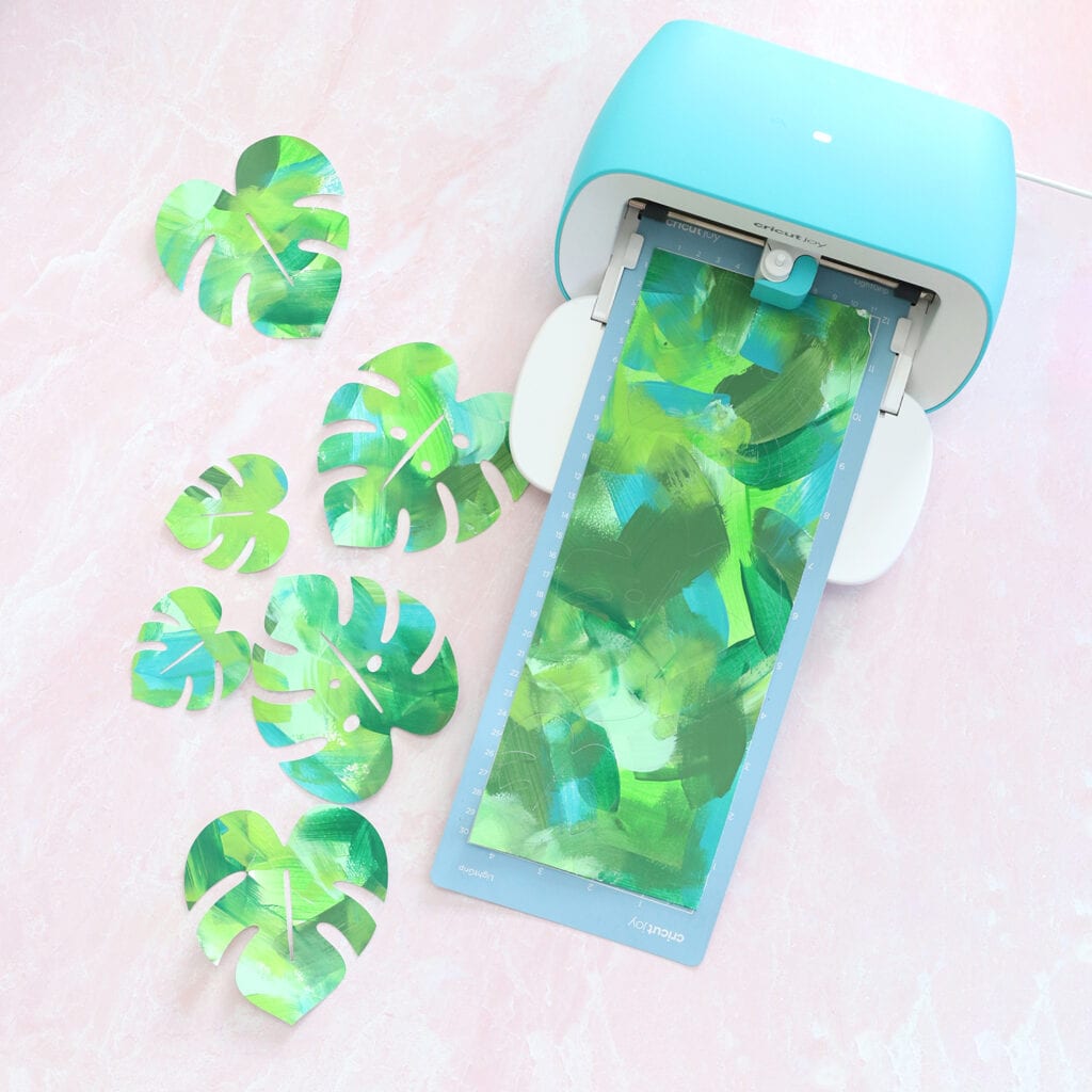 - Cut out monstera leaves from the painted paper and the green cardstoock using the Cricut Joy. Grab this exact project in Cricut Design Space by clicking HERE.