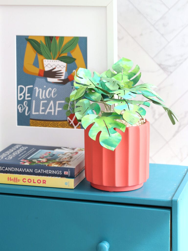 This paper monstera plant project is super easy to create with the help of your Cricut Joy. I love how easy it was to paint the leaves and that grooved planter from JOANN is a showstopper. This totally looks like something that belongs in the office of a fashionista, right?!