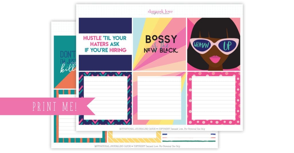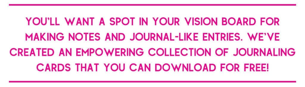 - Printable journaling cards – YAY! You’ll want to have a spot in your vision board for making notes and writing some journal-like entries. We’ve created an empowering collection of journaling cards that you can download for FREE!!!