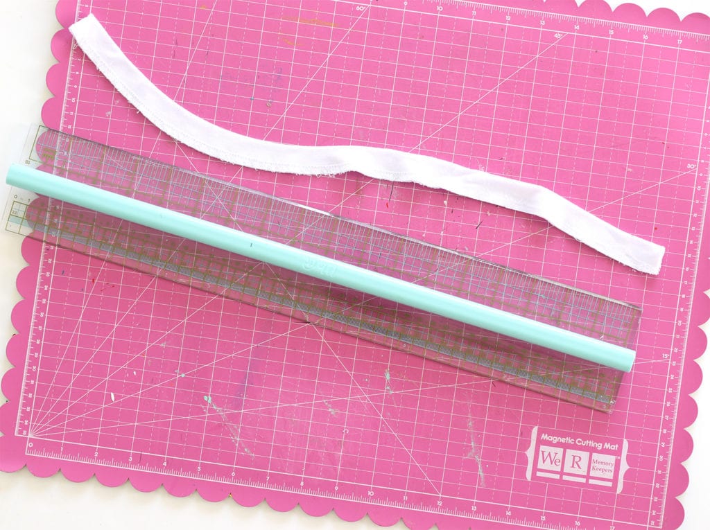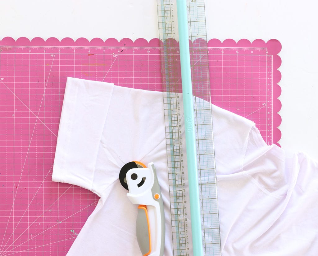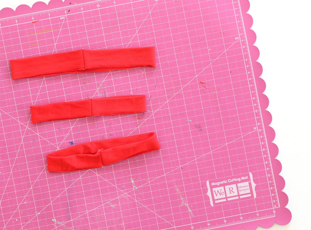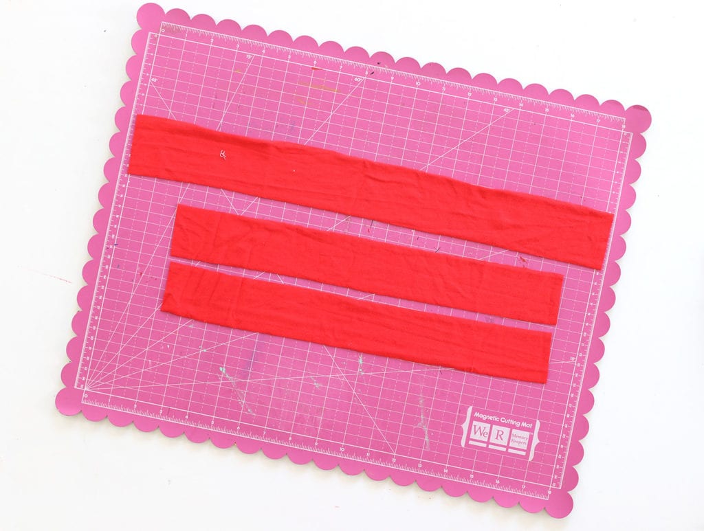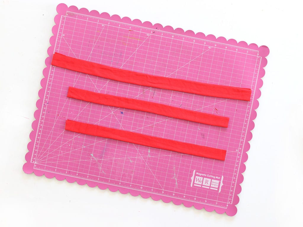 Now you’re ready to prepare the knit fabric accents. You’ll need to cut three pieces of fabric. Each piece of fabric should be 2″ wide. The length of the fabric will depend on the size tee shirt you are working with.