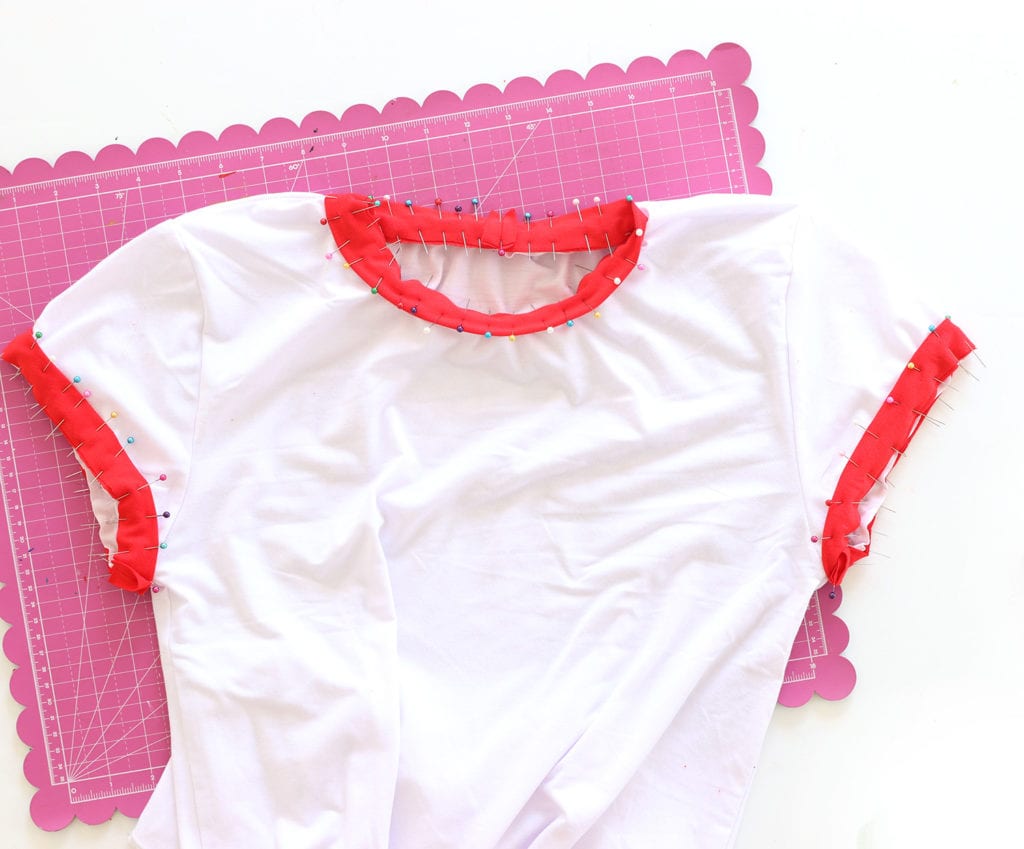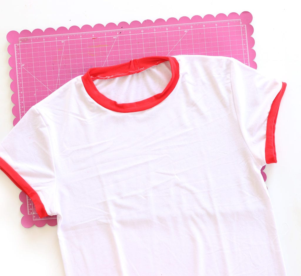 A ringer tee is made by adding contrasting ribbed bands to the collar and sleeves of a T-shirt.