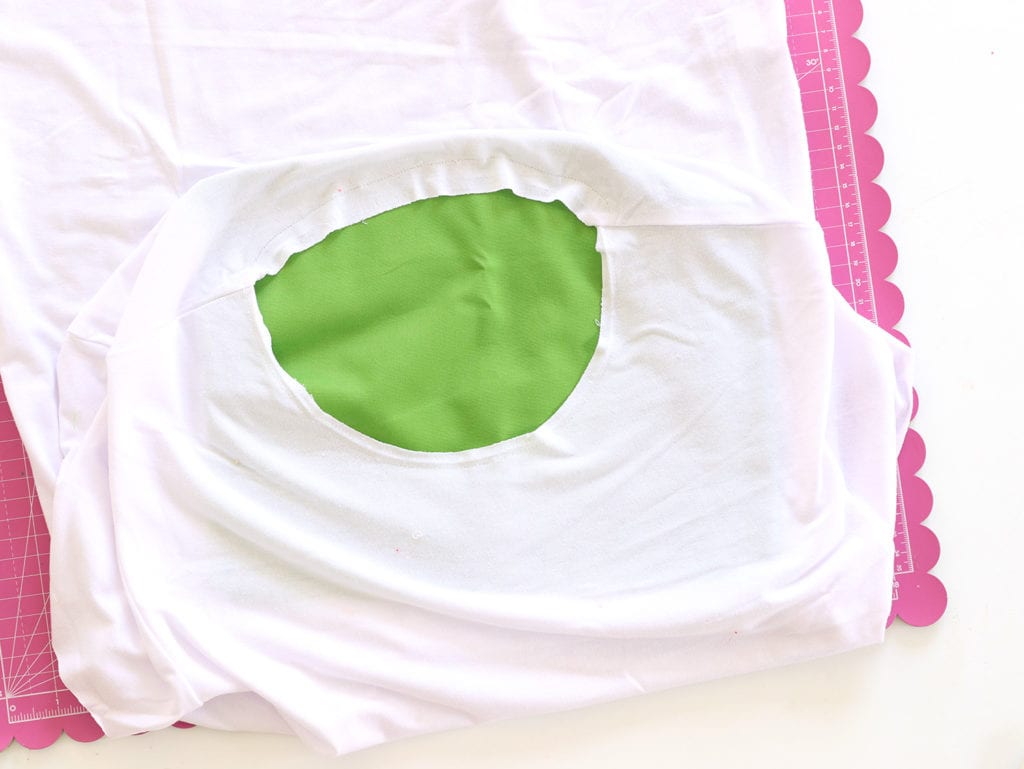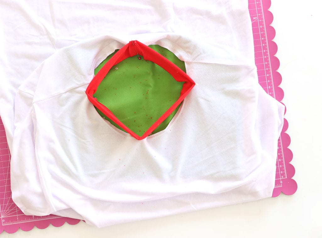 You are now ready to start pinning your knit pieces into place! Open the neckline of the shirt to a circle. I’ve placed a green piece of fabric in this photo to make it easier to see. Then anchor the knit collar piece into place by pinning at the top, bottom, left and right.