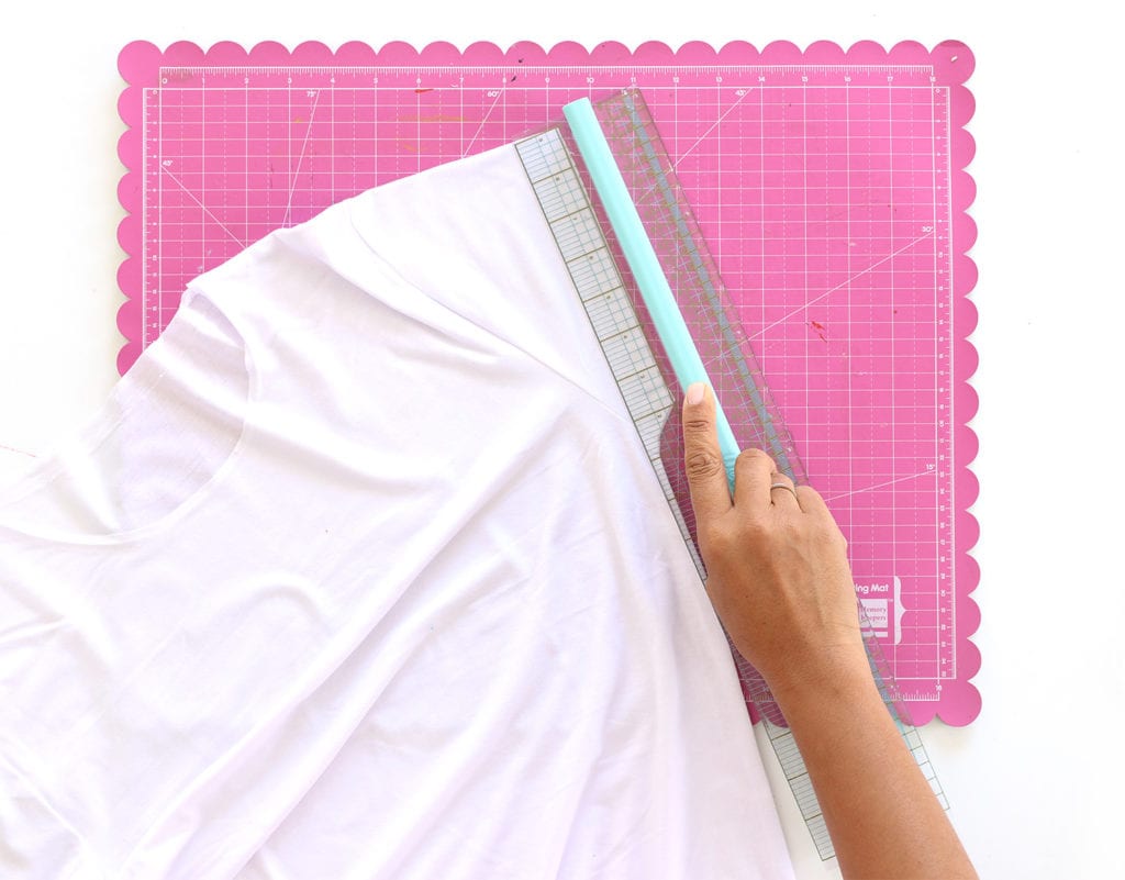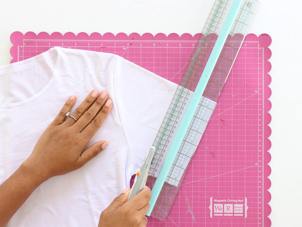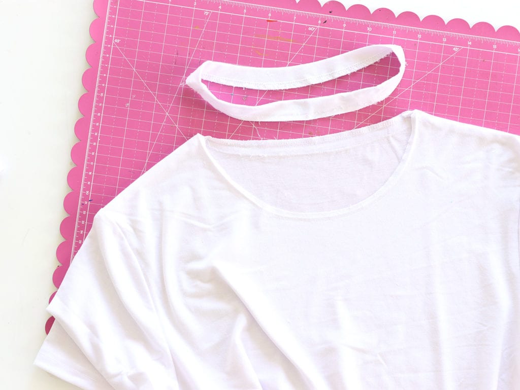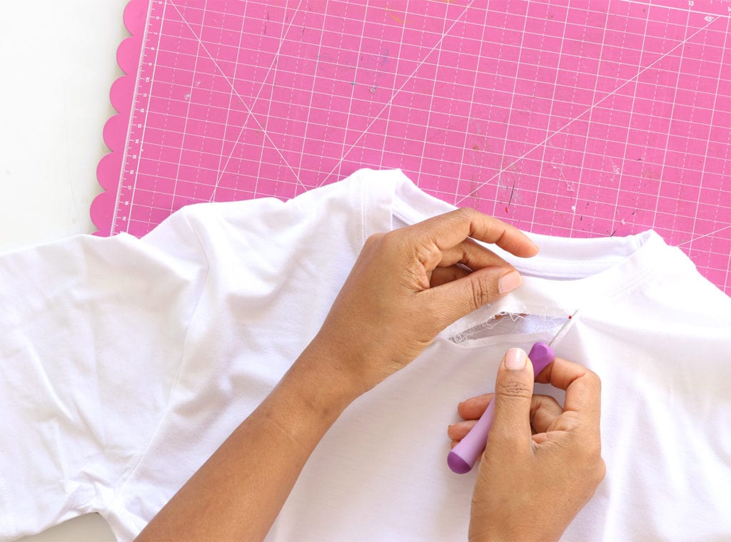 Use a seam ripper to remove the collar of the original Cricut Tee. Be warned – this is definitely the most tedious part of the projects. Cricut did a great job constructing these tees, so it takes some time to deconstruct!
