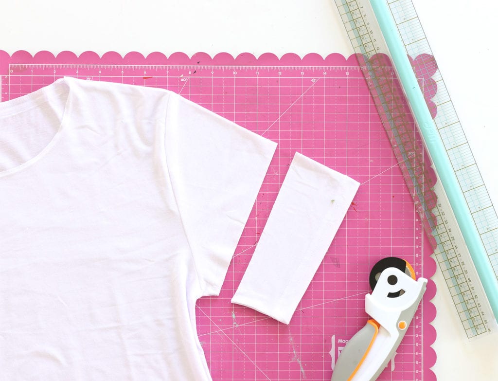 Now it’s time to trim the sleeves. I like a nice cap sleeve on my ringer tee, so you’ll want to shorten the sleeve a few inches. Once you’ve cut off one sleeve, use the remnant to cut off the other sleeve. This will ensure that both sleeves are identical.