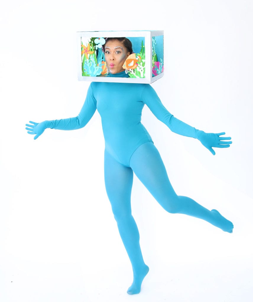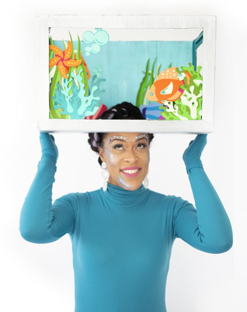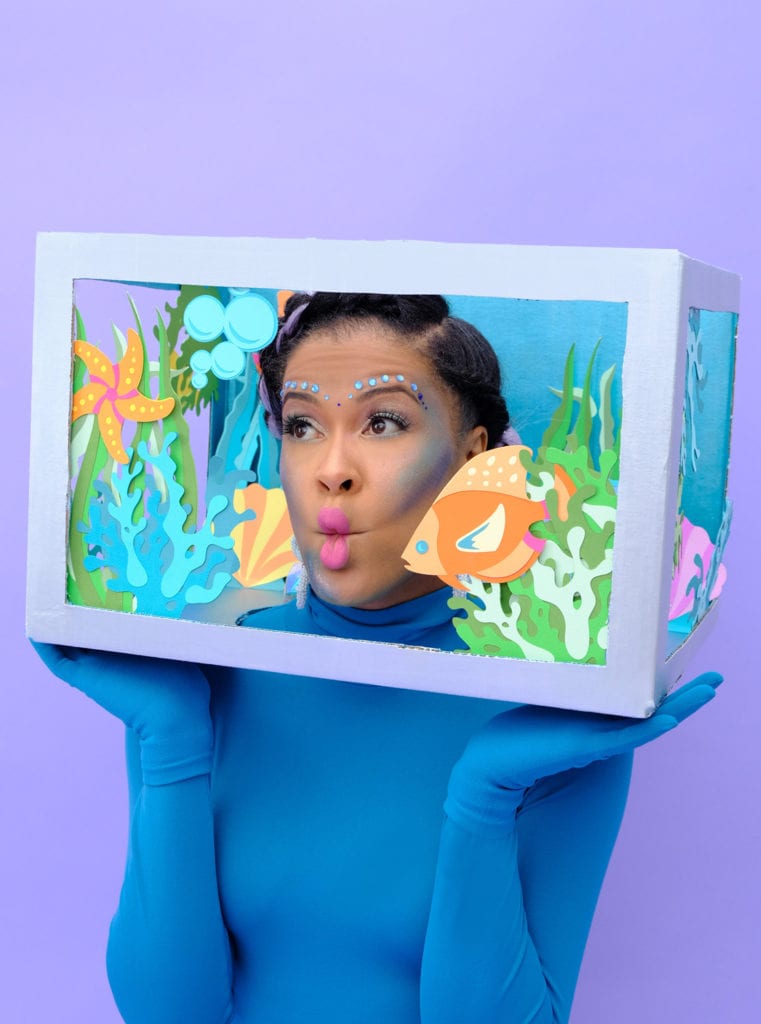 While I can’t help you too much with the first two, I can totally inspire you with a creative idea for those Amazon smile boxes! With Halloween creeping up on us, I’m going to show you how to create a DIY cardboard box costume …or BOXTUME…that is arguably the cutest thing ever! With a few layers of paint, some strategic cutting and a pile of colorful paper cuts or a few supplies from amazon.com/halloween, you can transform yourself into the best-looking aquarium the neighborhood has ever seen.