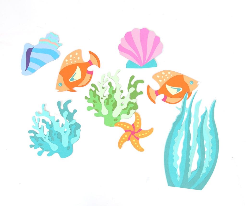 Use an electronic cutting machine like the Cricut to create paper embellishments for your aquarium! (Or, find premade cut outs or stickers!) Glue all the pieces into place and you have an aquarium!