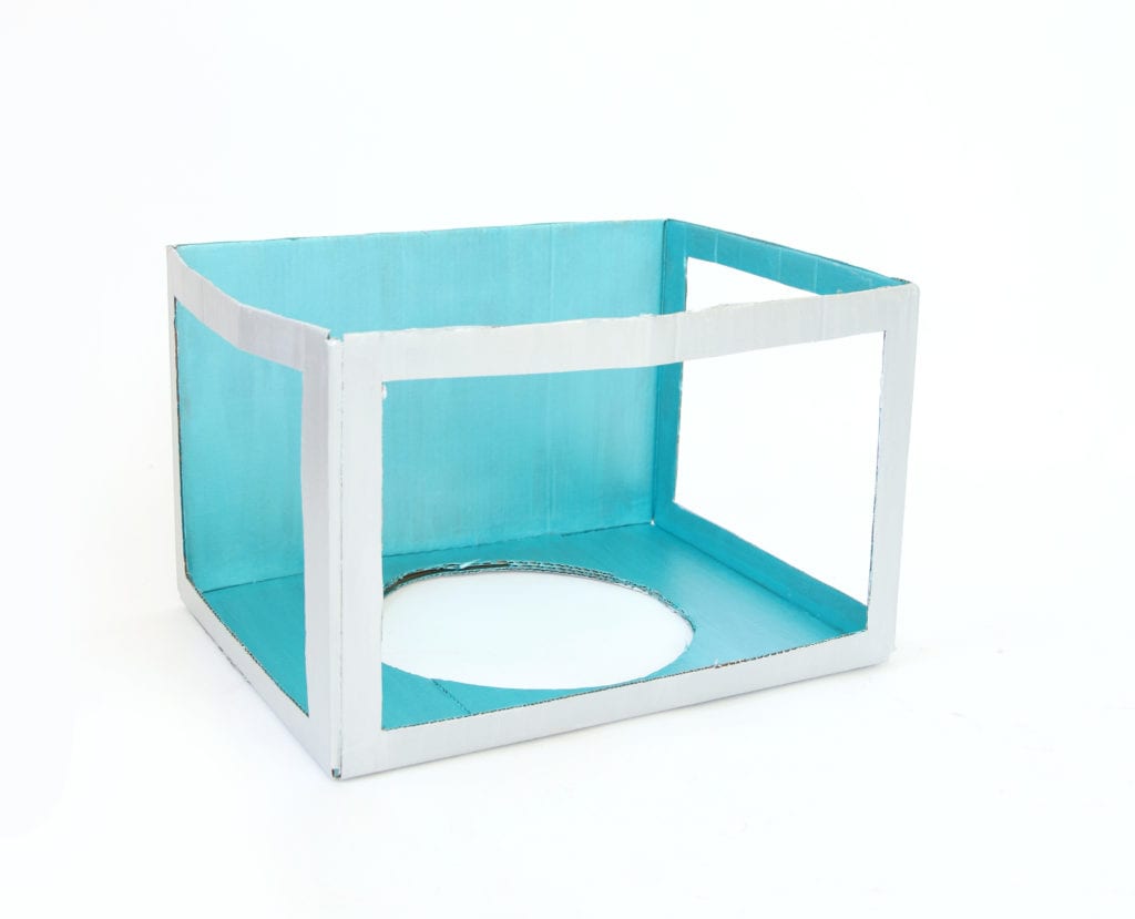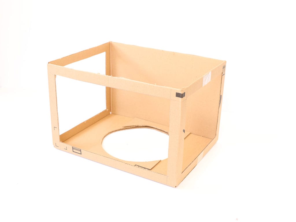 Use a craft knife to remove the sides and top of your box. Then cut a circle in the bottom. You’ll want to use some hot glue on the bottom flaps to make sure it all stays together.