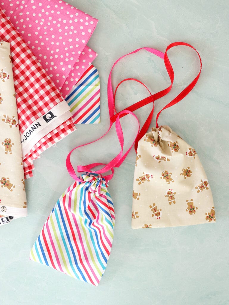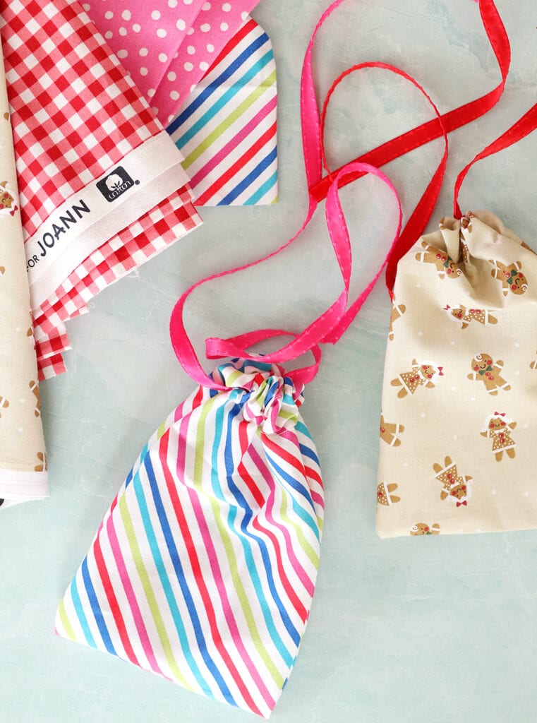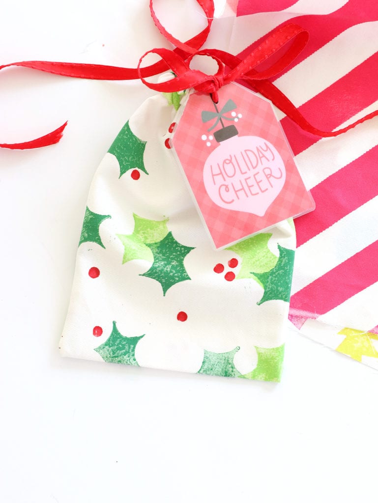 Turn the bag right side out. Then use a safety pin and ribbon to create the drawstring pull. Your fabric gift bag is now complete! This simple project is great for beginner sewers. In other words, you have NO excuse to not try this!