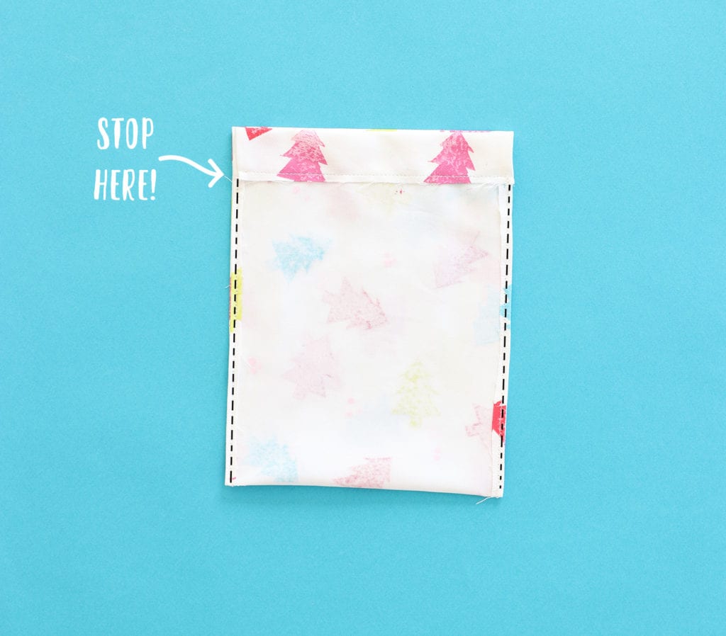 Fold in half with right sides facing and create the side seams by sewing up the edges along black dotted lines shown in the image above. Stop sewing and backstitch when you reach the top folds.