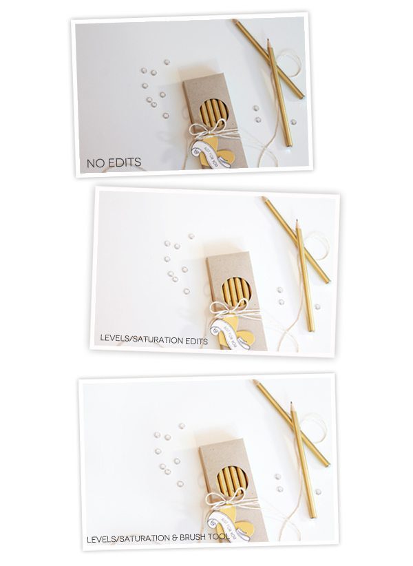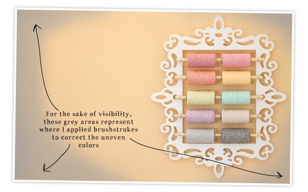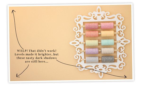 My adjustments to each photo usually only include levels and adjustments – I find that this gets me to where I want to be. A bright photo with vivid colors. Every so often, I break out the brush tool for a little airbrushing to remedy uneven backgrounds that result from uneven light. Here’s what I mean:
