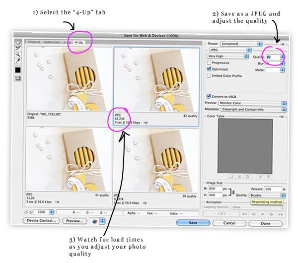 {3} As you adjust the quality, you will see the specs on your photo change. You’ll be able to see how it compares to the original file and what the load time will be. The goal is to find a balance between load time, quality and size. I typically keep my photos in the 70-85 range and that works well…your server will thank you for not overloading it! (I learned this the hard way!)