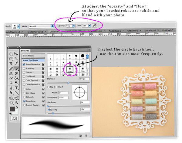 {1} Access your “Brushes” toolbar (Window>Brushes) and select the brush shape you will use. I work with larger sizes, the blending is better that way.