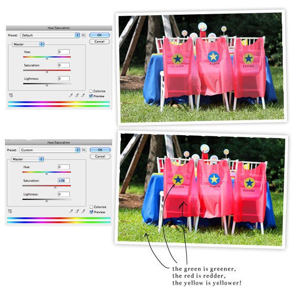 Once I’ve adjusted the Levels, I usually move to Saturation (Image>Adjustments>Hue/Saturation). I think of Saturation as the “er” tool. Not every photo needs more “er” but I like to add “er” to many of mine. What do I mean by “er” ? Saturation makes reds redder, greens greener, yellows yellower…you get the point. Saturation makes colors more…well…saturated. A word of advice about Saturation, don’t go nuts. Too much can make your photos look radio active. With that in mind – have fun with it! I found the Saturation tool especially useful for the Superhero Party I hosted. In this case, the colors needed to be super vibrant…