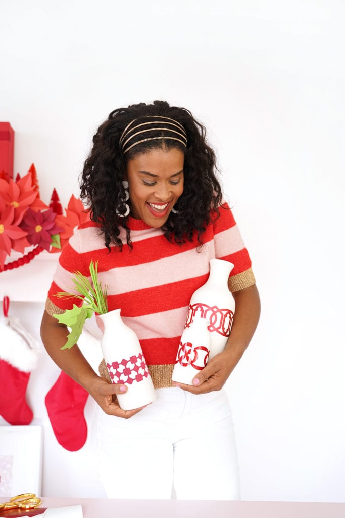 Now it’s time to apply the vinyl to your surface. For this project, I’m using some simple vases I grabbed from the JOANN floral department.