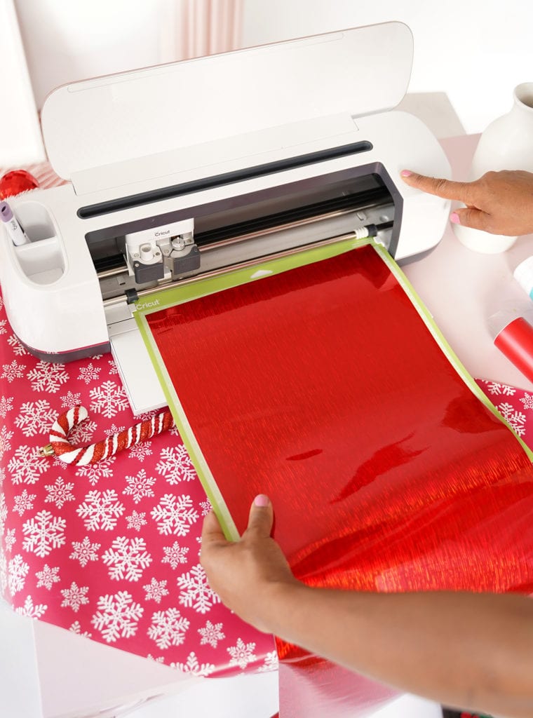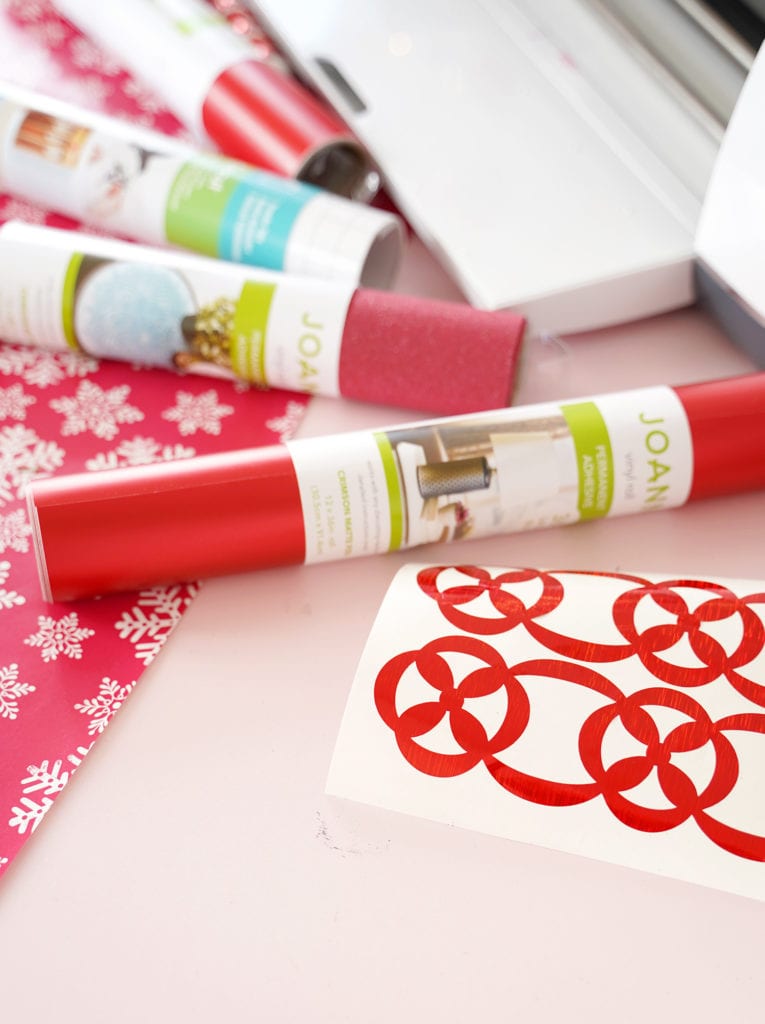 Recently JOANN released their own house line of vinyls that you can find in the exact same aisle with the Cricut products. You’re going to flip for all the colors and finishes available in JOANN vinyl and how they work seamlessly with all the Cricut vinyl that we know and love. My favorite feature of the JOANN rolls is that they offer lots of finishes for the same color. This means, my all-red, monochromatic holiday decor can have a touch of sparkle and sophistication by using the Crimson Glitter, Crimson Brushed Metal and Crimson Laser vinyls. All the same color, but slightly different finishes.