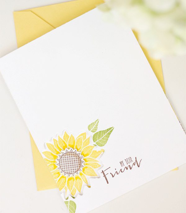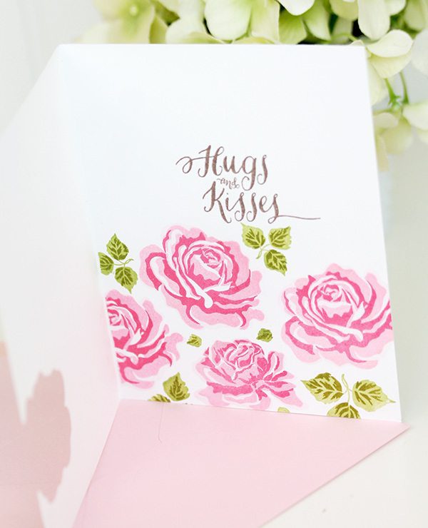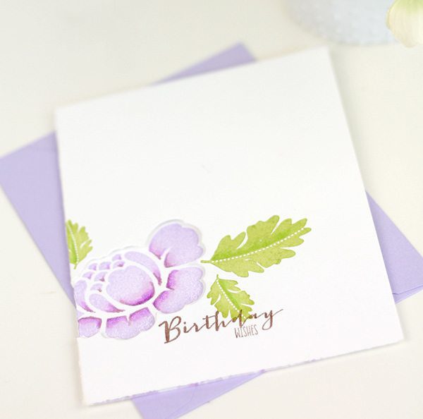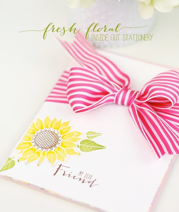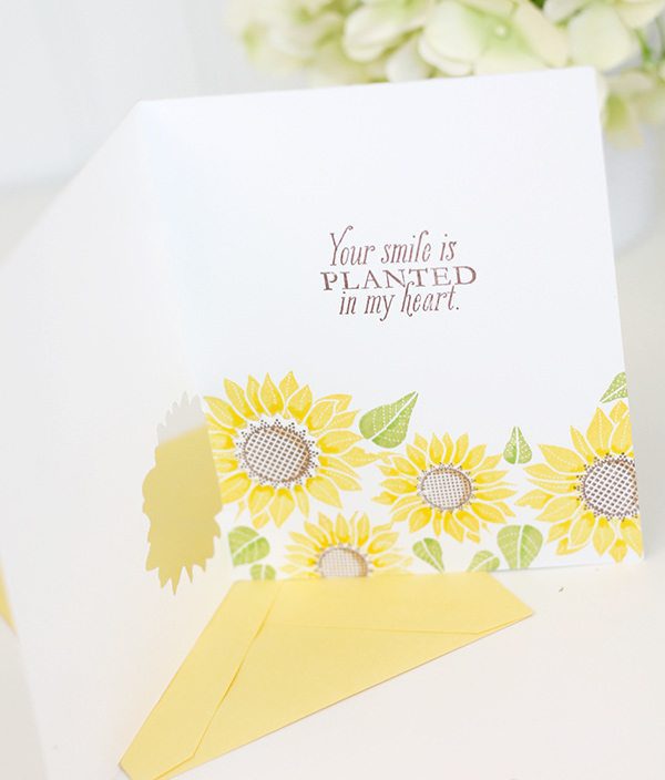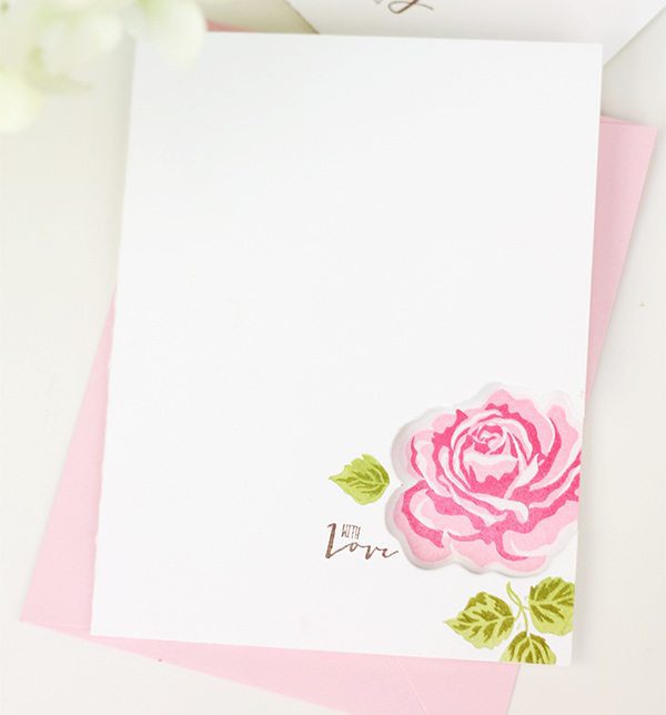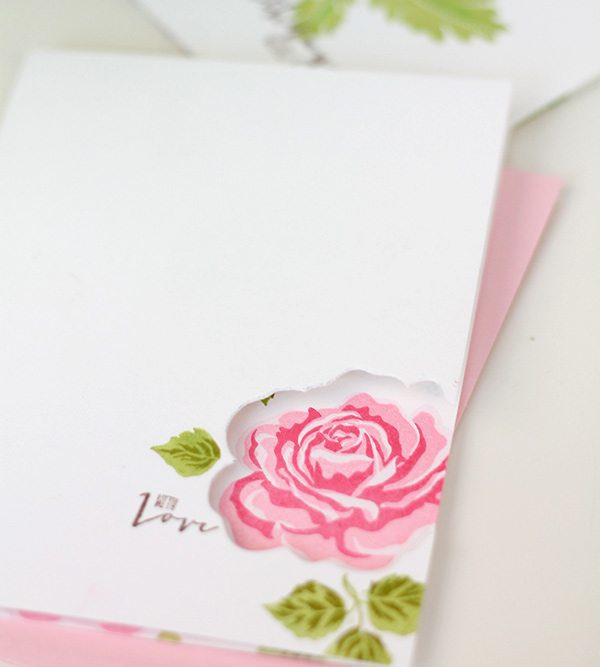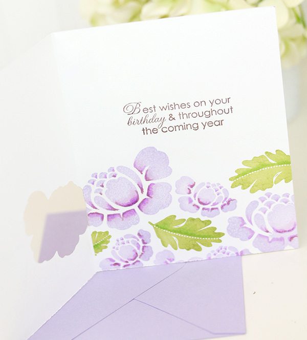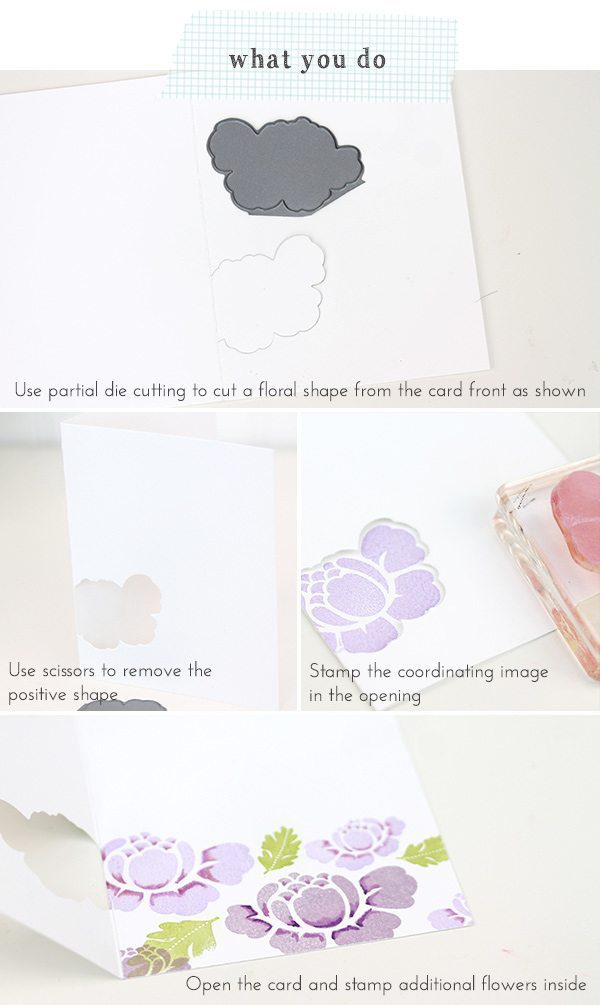 If “partial die-cutting” is greek to you – check out THIS post from the archives to get an idea of how it works. The partial die cut allows a portion of the image to come through to the front of the card, leaving you lots of space on the inside of the card to stamp a beautiful floral pattern. The technique is easy but the result is something the recipient will love.