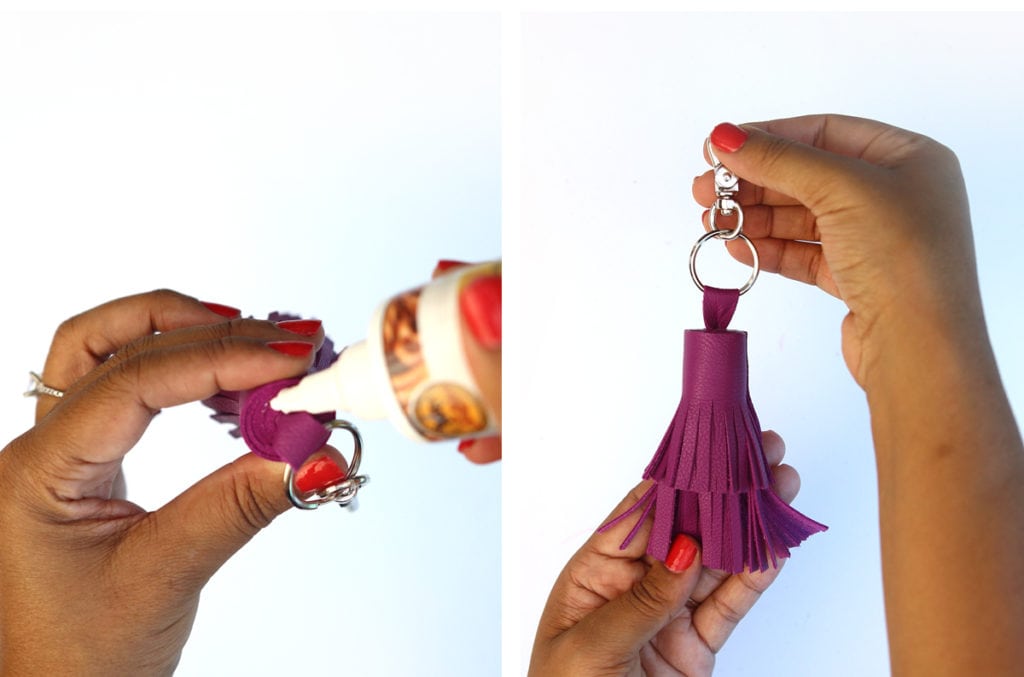 - Apply glue to the top of the tassel – this will ensure that everything stays in place and you can use your keychain over and over for years to come