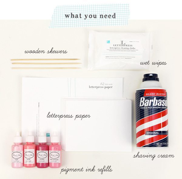 There’s a chance that you’ve seen shaving cream & paint used to create marbled paper – I am certainly not the one who invented it. Shout out to that genius person who did. Instead, I’m here giving you a a slight variation of shaving cream marbling and adding a little letterpress love. I’ll let you know straight up – this is not the neatest and cleanest project. You’ll have messy fingers in the end, but everything is washable and the finished product is totally worth it