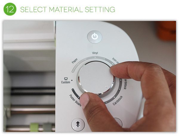 Next you’ll be prompted to adjust the material setting. This setting is controlled by a knob on the side of your machine. For this particular iron-on, I found that the “Cardstock” setting worked best since it is a bit thicker than normal.