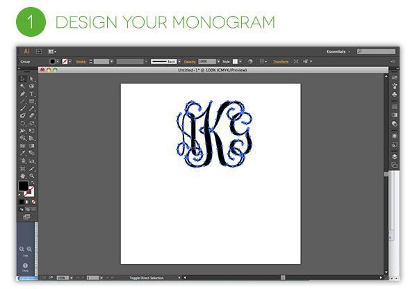 First you’ll need to design your monogram – and if you’d like to customize your monogram, you’ll need to design it in a program such as Adobe Illustrator. Here’s how I designed mine: