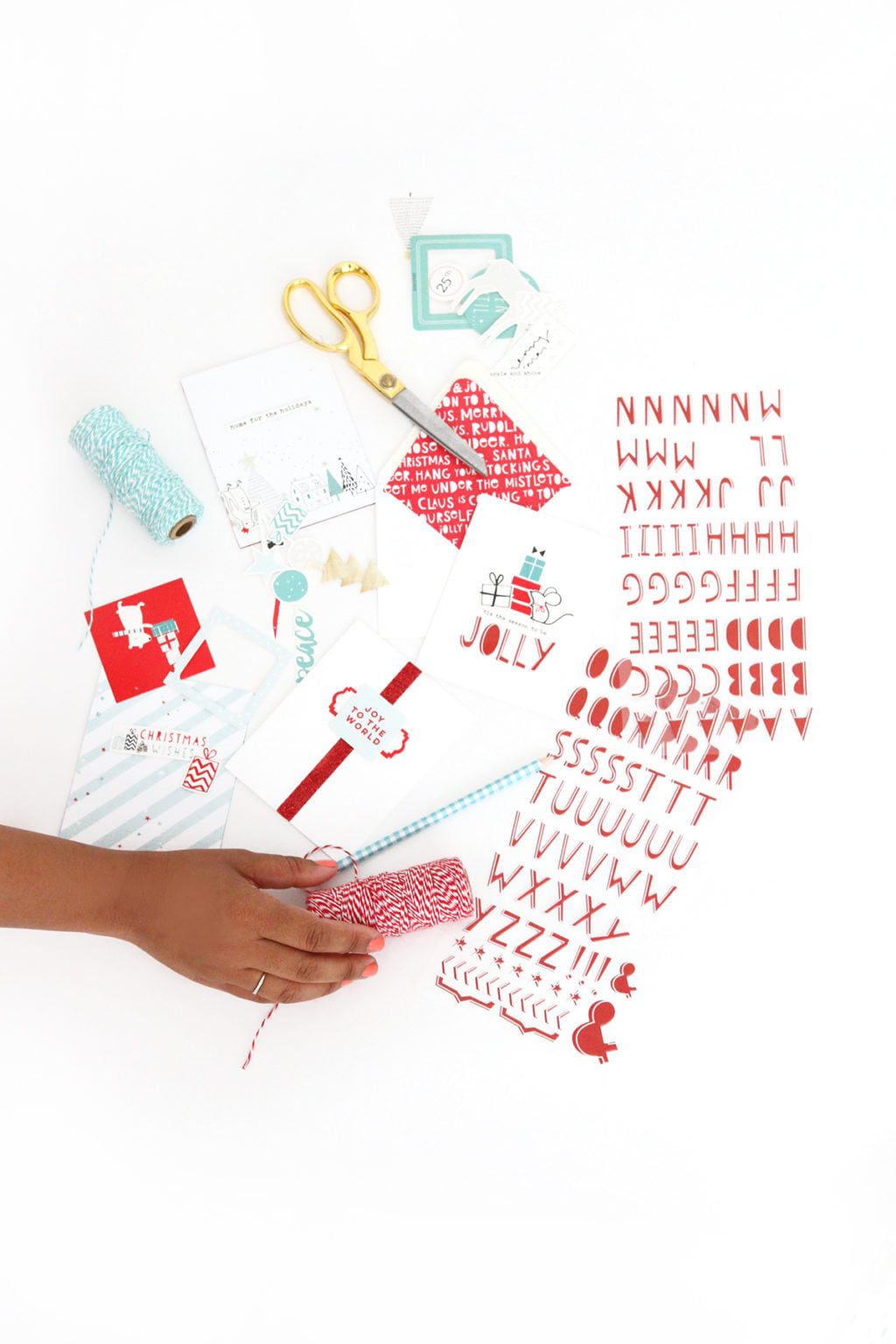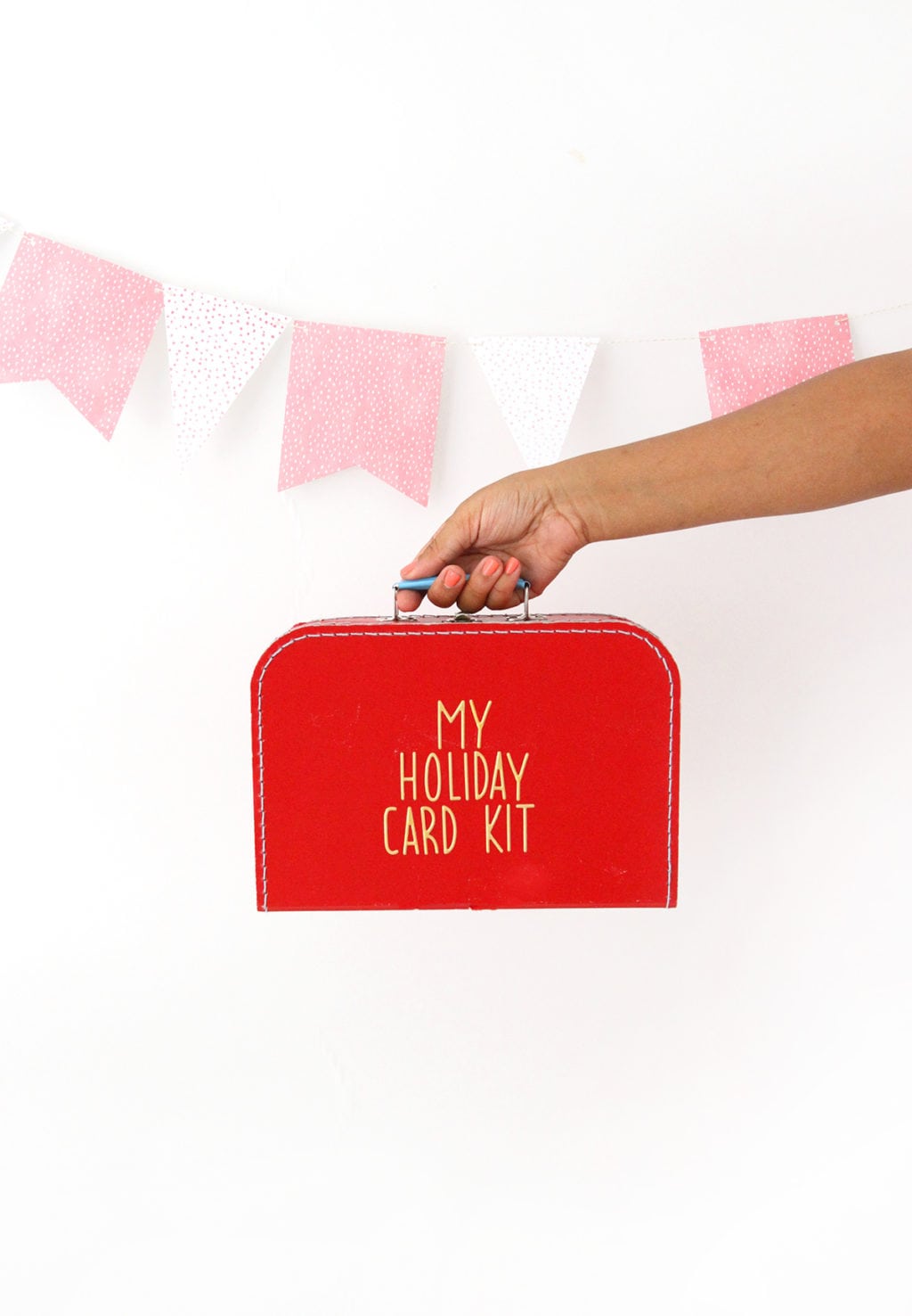 I opted for a little paper suitcase that is perfectly sized for all these goods. With the addition of a few alphabet stickers, the suitcase become my official holiday card making headquarters.