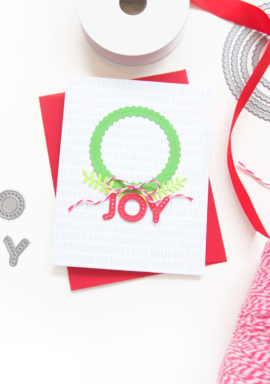 In true Damask Love style, I kept it simple and bold with a graphic wreath created from the new Stitched Mini Scalloped Circle STAX die set. Beneath the wreath I added a few little sprigs of green with the new Leafy Greenery set. Nothing fancy, but completely my type of stationery.