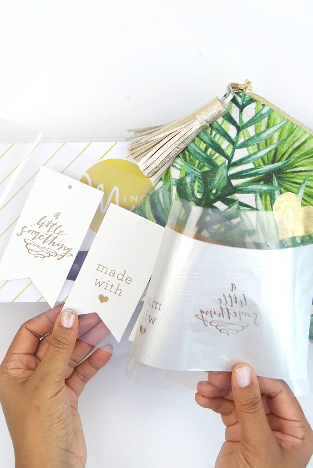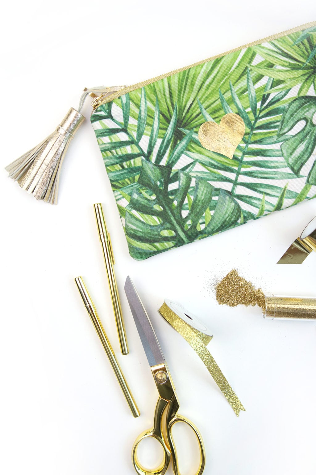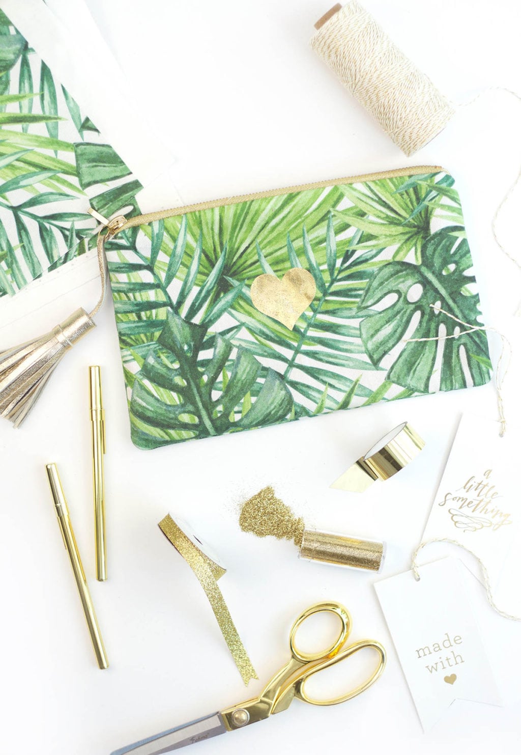 I stitched my fabric into a zipper pouch but you can use it any way you wish. It’s perfect for a special gift, so I also foiled a few preprinted tags. Can you tell from the looks of these photos that I’m in a gold state of mind. The combination of gold and palm fronds is so perfect for a Miamian like me or for those of you who want to hold on to every bit of summer that you can.