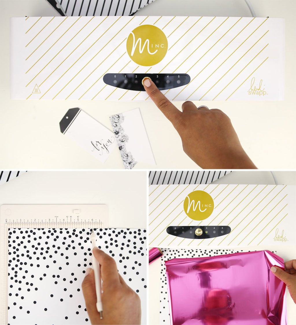 - Turn on the Minc machine and press the center button to select the desired thickness setting. For the paper I used in this project, you’ll want to select “3”