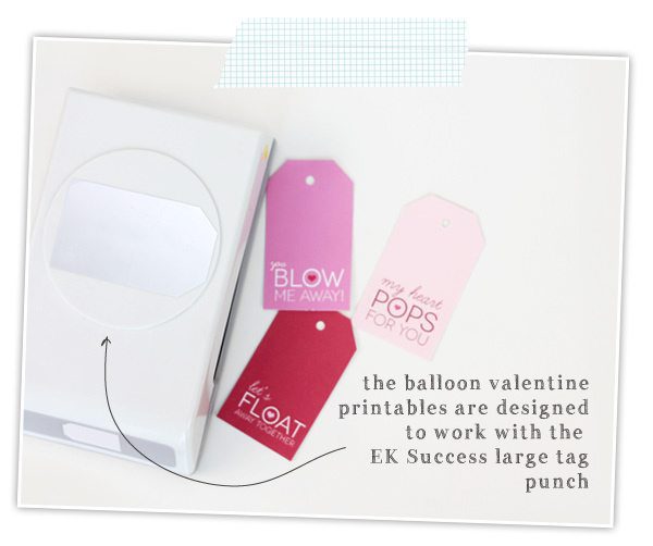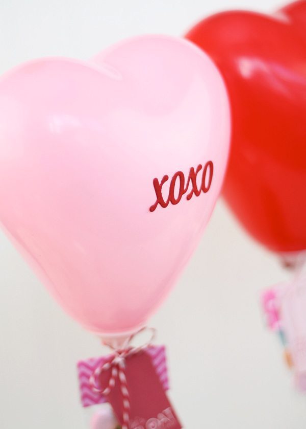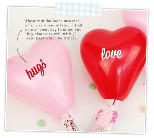 These days, we don’t have any room for a helium tank but that doesn’t mean I can’t get crafty with balloons – especially when those balloons are 6″ mini, heart shaped balloons embellished with die cut stickers, printable tags and bags of candy. Yeah. I dare you to come up with a cuter valentine favor. These are easy to assemble and great for mass production.