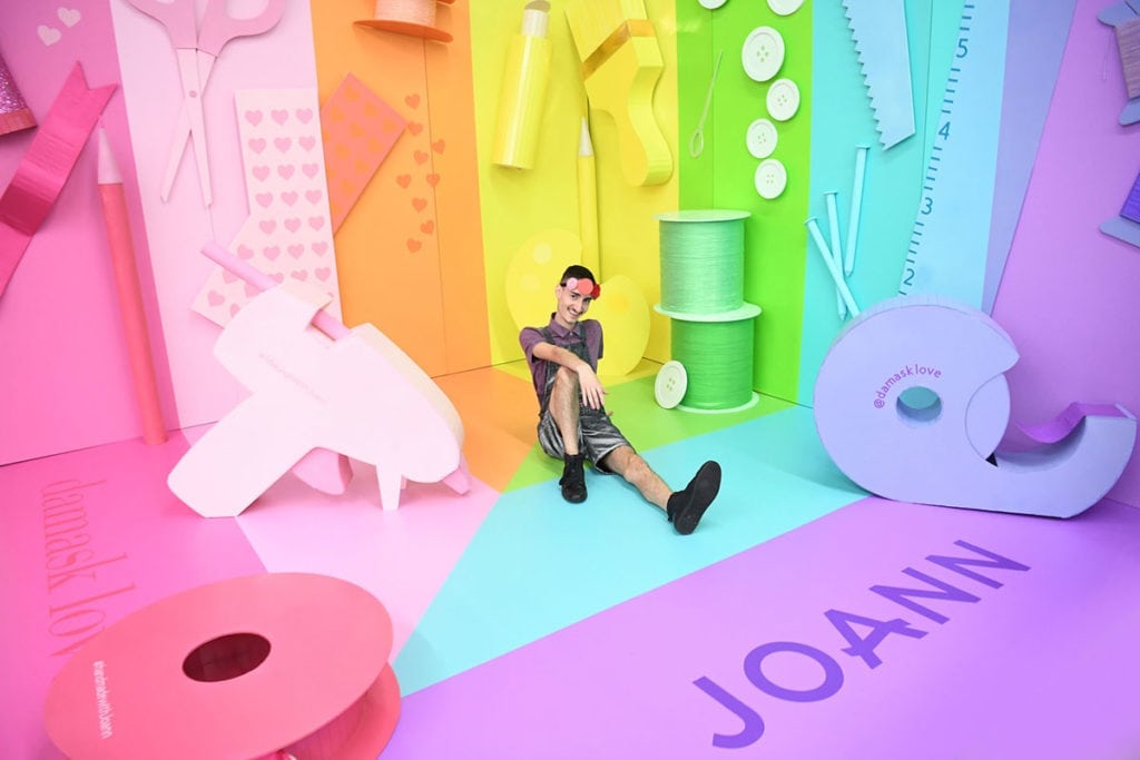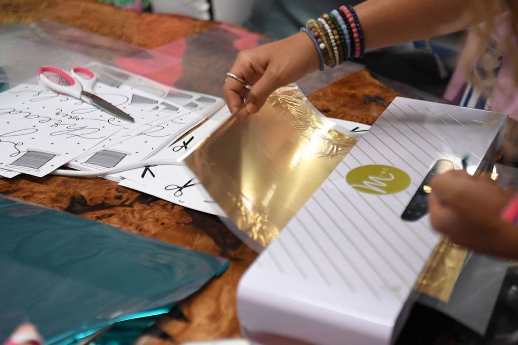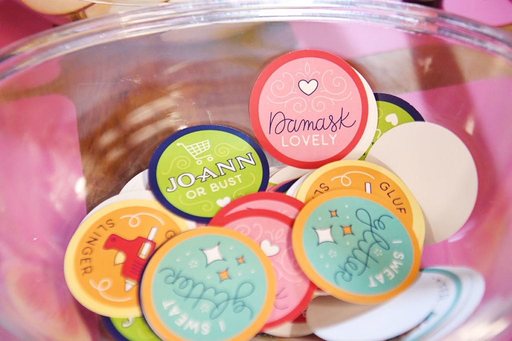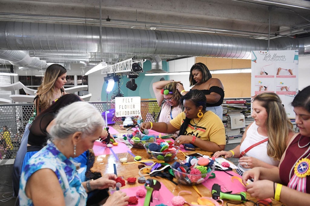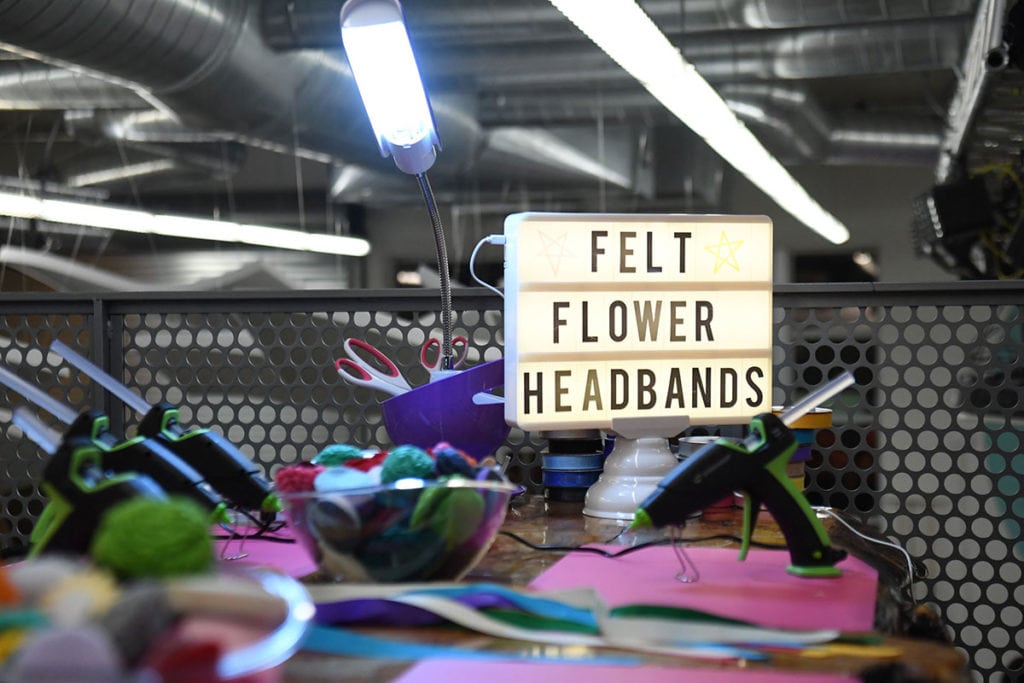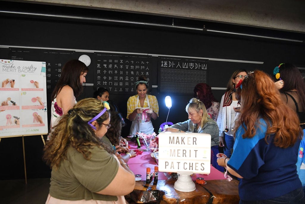 Now, rainbow photoshoops* were not the only thing to keep busy once the doors opened! Upstairs was a trio of maker stations featuring crafting supplies from..yep, you guessed it…JOANN! Guests moved from station to station and created their own felt floral crowns, crafty merit badges and foiled wall art.