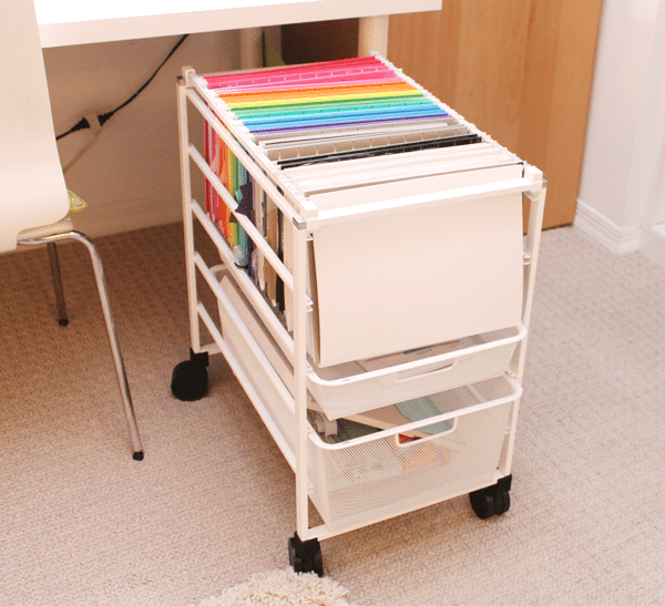 I keep my cardstock organized in coordinating hanging file folders, which is mostly for function, but it also looks pretty! It’s really nice to have my “most used” supplies at an arm’s length away! Of all the organization tools in my craft room, this file cart is by far my favorite!