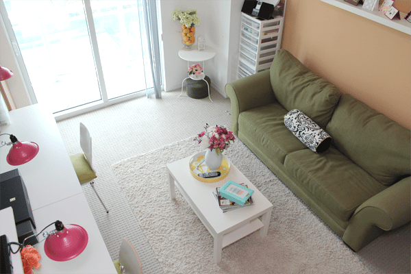 Since the craft room serves as a guest room, I couldn’t take over every single inch of wall space with my supplies (….yet). To make the room a little more cohesive, we opted for a pull out sofa that can easily be tucked away when we don’t have guests. This allows me to have a really nice sitting area for hanging out, flipping through magazines or watching television…when certain husbands in the house have hijacked all forms of media in the living room with *insert sports show/game here*