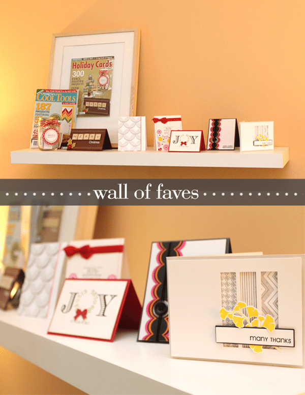 Above the couch, I installed a floating shelf where I show off all of my favorite cards and my Paper Crafts Magazine covers! Even if you have just a few inches of spare space, I really suggest using it to show off your favorite designs. For me it’s really inspiring to see them up there on display! Makes me feel like I’m a legitimate crafty girl.