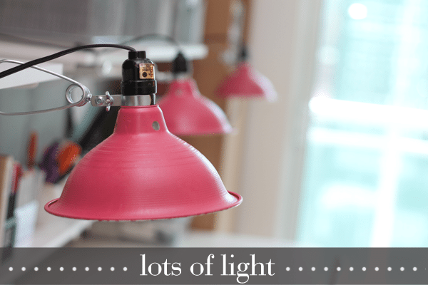 One of the MOST necessary components of my craftroom layout is lots of light. Since most of my creating is done in the wee hours of the night, I can’t take advantage of Mr. Sun, who come beaming in from the large window…so instead I have to create my own. To give me strong, bright, white light, I use clamp work lights which I fit with Ecosmart 14 watt (60 watt equivalent) daylight bulbs. Now, just believe me when I tell you that these bulbs will light your workspace up like Christmas at the Griswold’s and they last FOREVER. I kid you not. I have had the same light bulbs in these lamps since Damask Love started in January 2011. How’s that for a “shining” endorsement! I got the idea to spray paint the lamps from this post over at Little Green Notebook – and I’m so glad I did. Makes it so purdy!