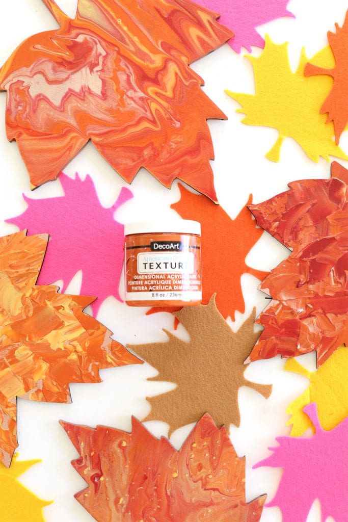 When you live in Miami, you’ve got to make your own fall..because around these parts, the leaves don’t change and the temperatures only get slightly cooler. Depending on where you live, there’s a chance you’re still waiting for the autumn colors to arrive and today’s project will definitely get you into the spirit. As you know, I love using bursts of color for fall and with the help of DecoArt Texture Paint, I’m able to inject color and texture into a few pieces of ombre autumn leaf decor. Join me in this quick Facebook Live video to see how I used DecoArt Texture Paint to create these wow-worthy fall leaves.