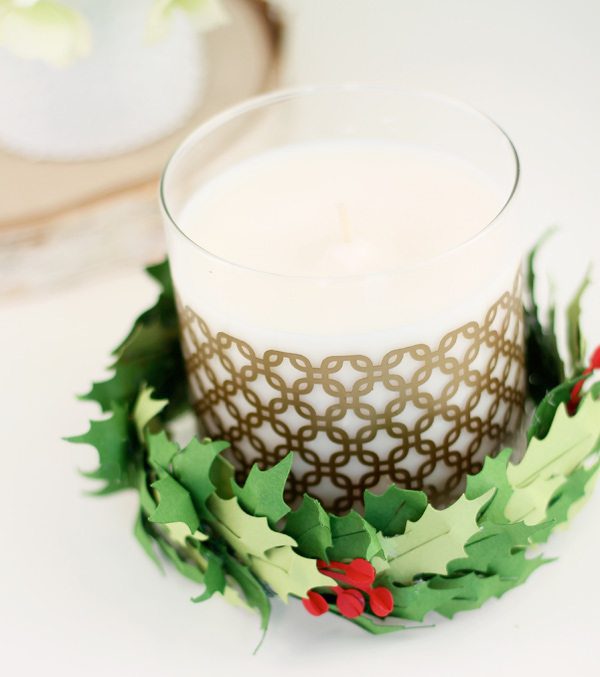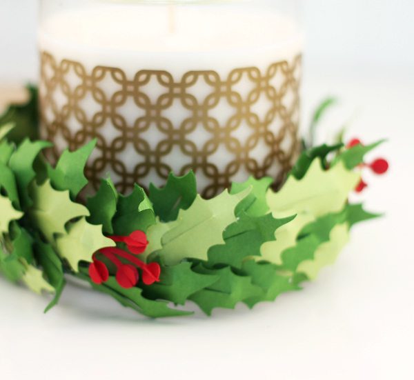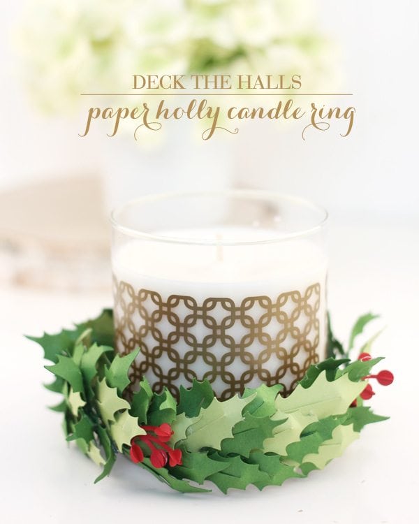Mmkay. Remember that gold vinyl candle we made a couple of weeks ago? Well, it needed a little dressing up – and far be it from me to ever say “no” to dress up. So, today we’re decking the heck out of the halls with a beautiful paper holly candle ring that I’m a little bit obsessed with. You can use this for your own home or give it as a gift. Either way, everyone will be happy – but mostly you, since you will have made something beautiful.