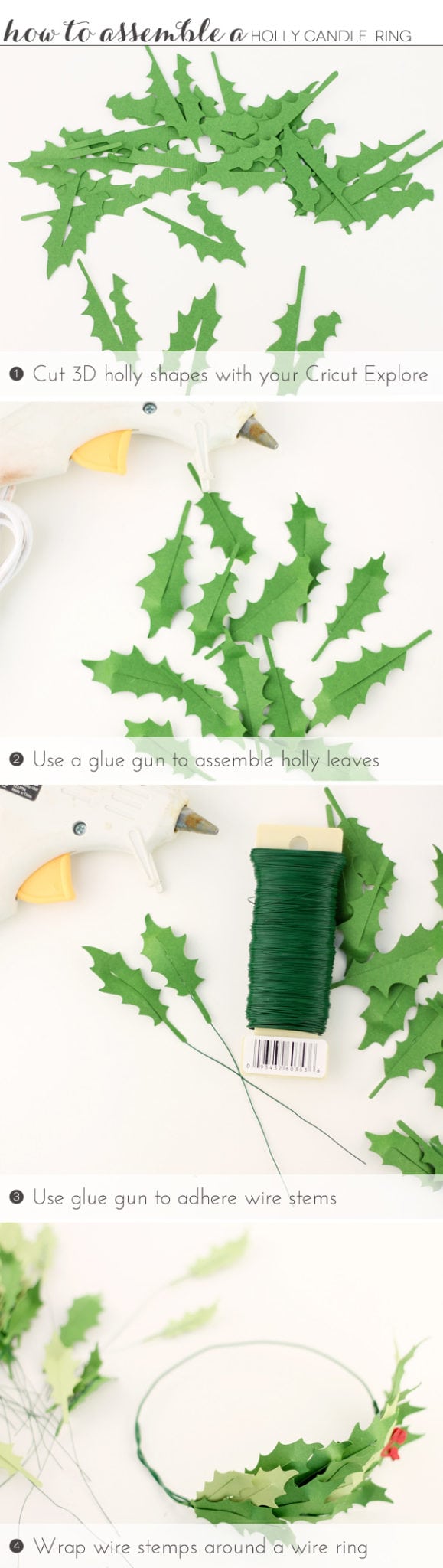 I broke out my Cricut Explore for this project and called up the new 3D Florals image set which is packed with really nice dimensional florals and leaves. The holly leaves were calling my name – so I cut about 75 of them from green cardstock…afterall, it takes the same amount of effort to cut one leaf as it does to cut 75 – and that effort level would be zero. Just press “Go,” walk away and stare at the wall until the Explore is done cutting.