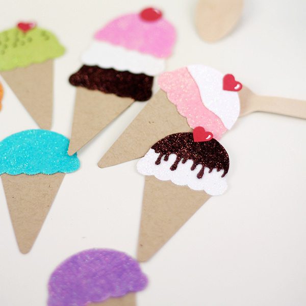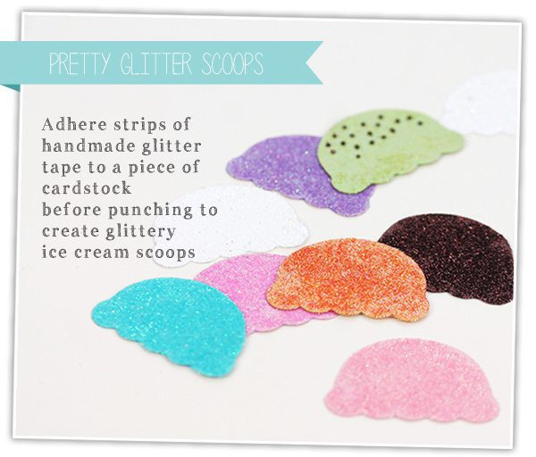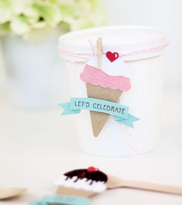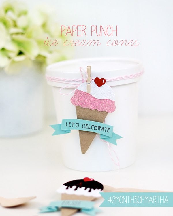Paper Punch Ice Cream Cones | Damask LoveThese cute little cones are great to use as tags, which is exactly what I did. I added a banner to each cone and tied them onto a paper ice cream container. For a tutorial on creating a similar banner, visit this post from the Damask Love archives.