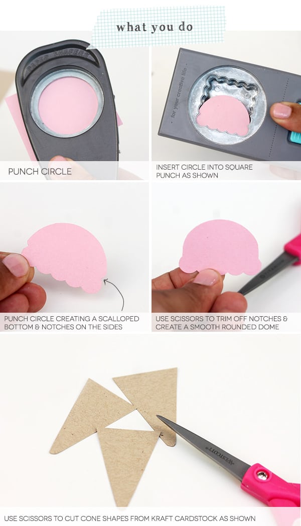Actually, I take that back. We’ve got plenty of sun here in Miami. It’s kind of hard to believe I live in the same country as people dealing with ice and snow right now. Yesterday, I saw a lady wearing a crop top and cut offs. Don’t get me started on crop tops. They look good on no one. But that’s neither here no there. For all of you who are still sporting thermals, I’ll do you the favor of not posting pictures of me in a crop top but instead I’m bringing you a little bit of warmth in the form of really cute paper crafted ice cream cones that you can make with a couple of basic paper punches. They’re easy to make and will summon thoughts of warmer days. A win-win. And there are no midriffs involved. A win-win-win.