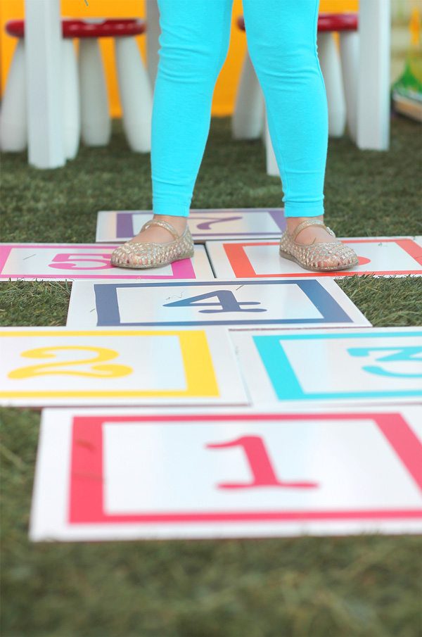 hard to choose a favorite, but this floor tile hopscotch may just be it. This was an 11th hour addition to the playroom and I’m so so happy I squeezed it in. I took 12×12 porcelain floor tiles and added colorful framed numbers to each one. The project took me less than thirty minutes to create, but it has a huge impact!