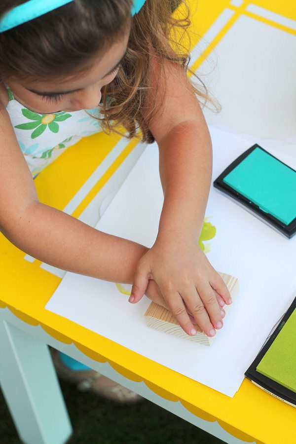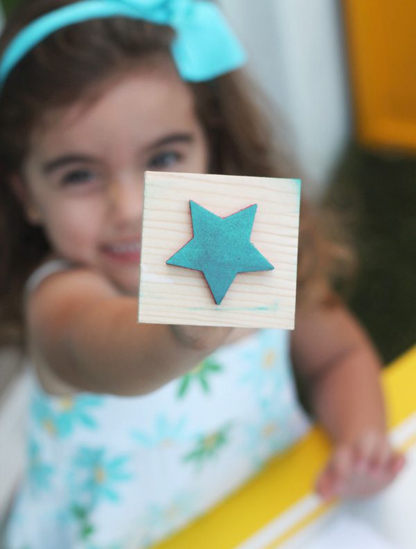 The Cricut Explore has a setting for cutting craft foam, so I went to work cutting out a few basic shapes from red foam. Next, I adhered the foam to small wood blocks and added a knob handle. Instant stamps that your kids will love.
