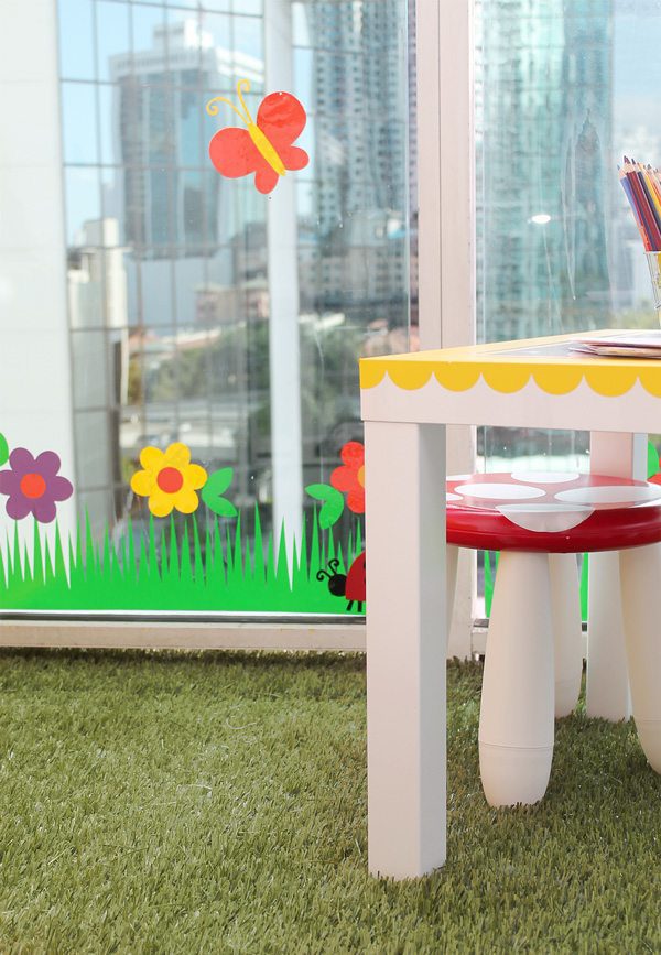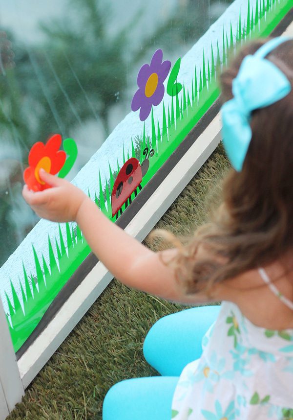 I added a cling garden along the balcony windows as a final touch. The window cling material is really easy to work with and very forgiving. You can take it off and put it back as many times as you need until you get the perfect placement…and if it loses a bit of it’s “sticky power” just run the cling material under water and let it dry. BTW, how cute is that little lady bug peeking out?