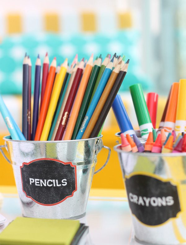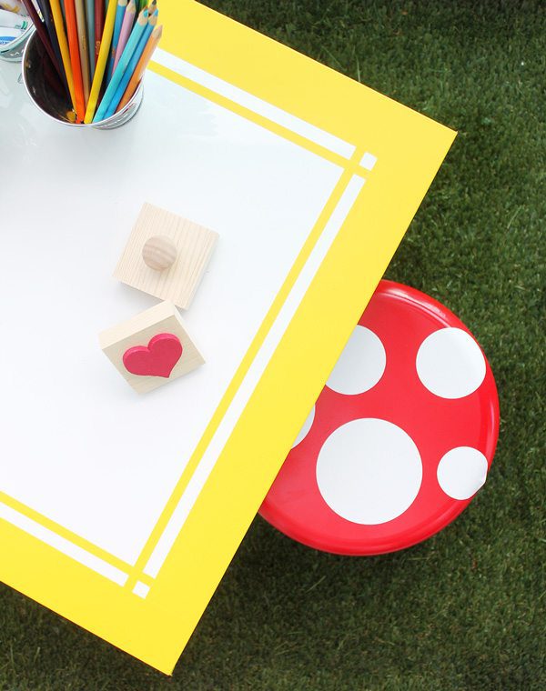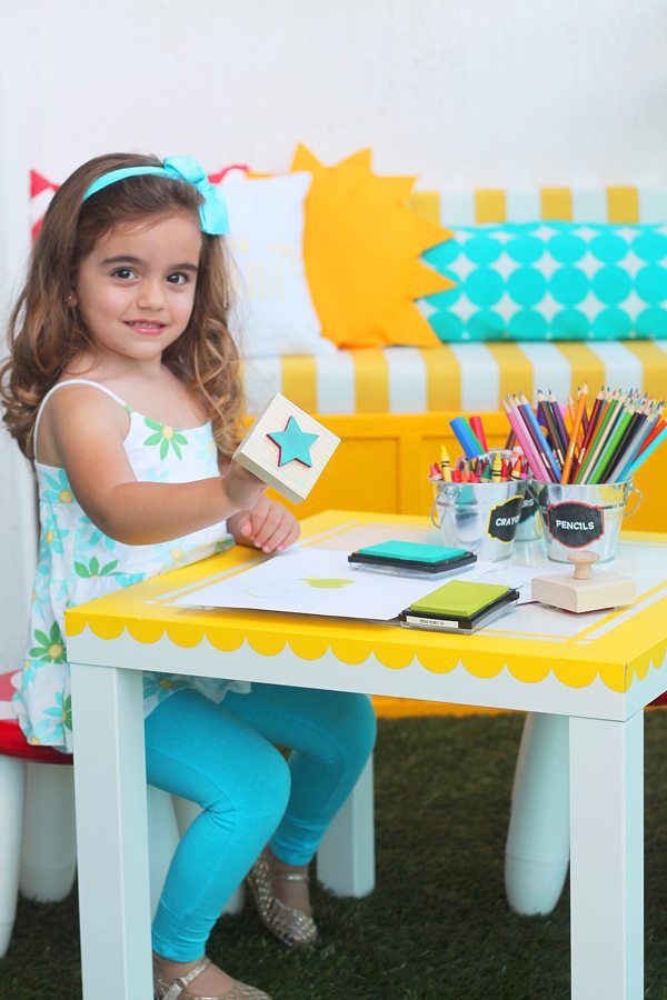 I dressed up the table with scalloped strips of yellow vinyl that I placed around the edges and thin straight strips that I applied to the top for a simple criss-cross pattern. With the table done, I filled it up with supplies that will spark creativity. Every playroom needs something to play with, right?