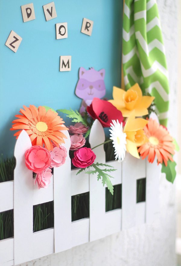 To create the window box, I cut birch sheets in the shape of fence posts then adhered the fence posts to a premade wooden crate. A little white spray paint finished it up. I filled the window box with faux grass and paper flowers that were all cut from images in Design Space. The faux-garden fun doesn’t stop there, though…