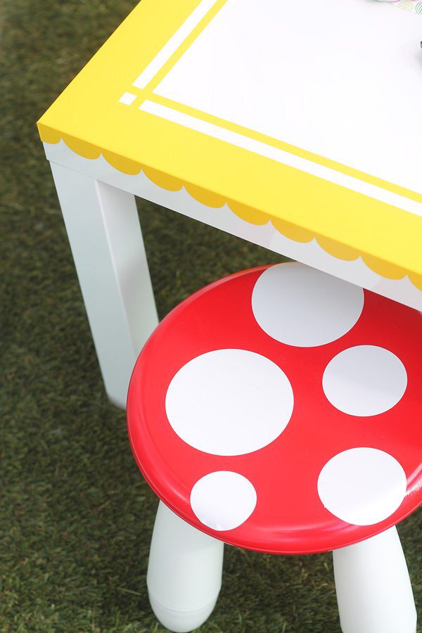 An adorable table and chair set are the anchors of this outdoor playroom – and you will love how easy and affordable they are to create. The Lack table and Mammut children’s stools are both incredibly easy to DIY. I spray painted the tops of the stools with my favorite red spray paint then added white vinyl circles cut in various sizes. The result? “Toad”stools! Get it? Toadstools. Did you just die?