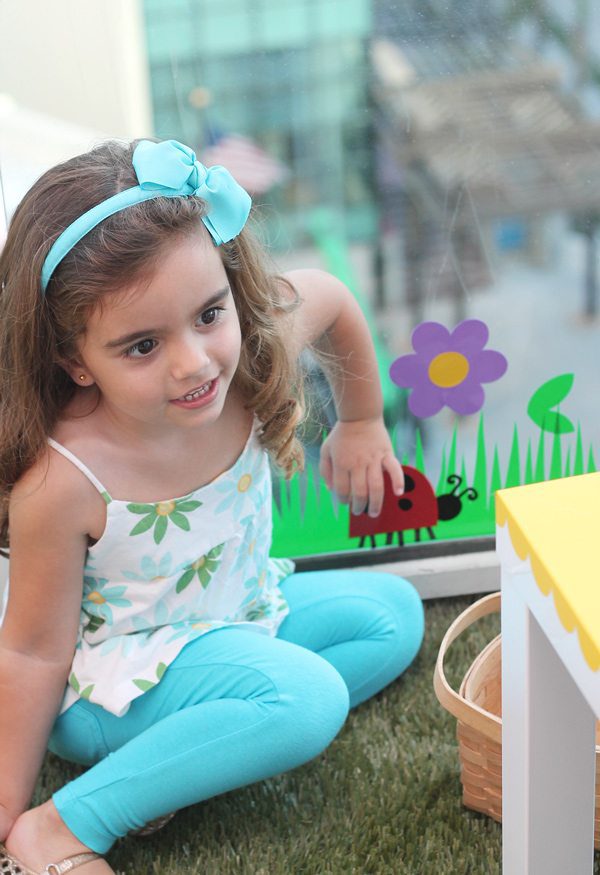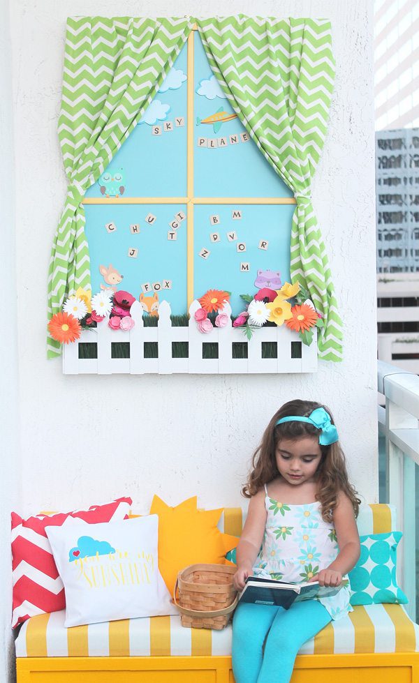 If you don’t have a balcony or would prefer to bring this playroom indoors where ongoing supervision is less necessary, you can totally use any of these ideas on the inside of your home. Use the window cling garden on any window in your home – or even along a wall. Add felt to the bottom of the floor tiles and create an indoor hopscotch. The magnetic learning board can be placed anywhere and I’m sure you can come up with lots of variations to work with any theme.