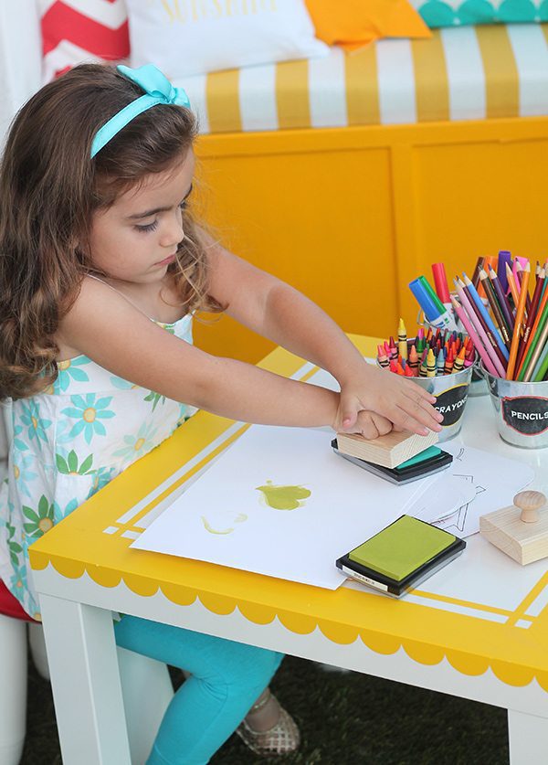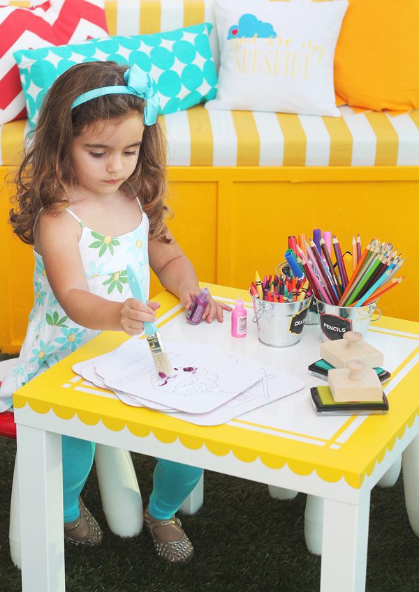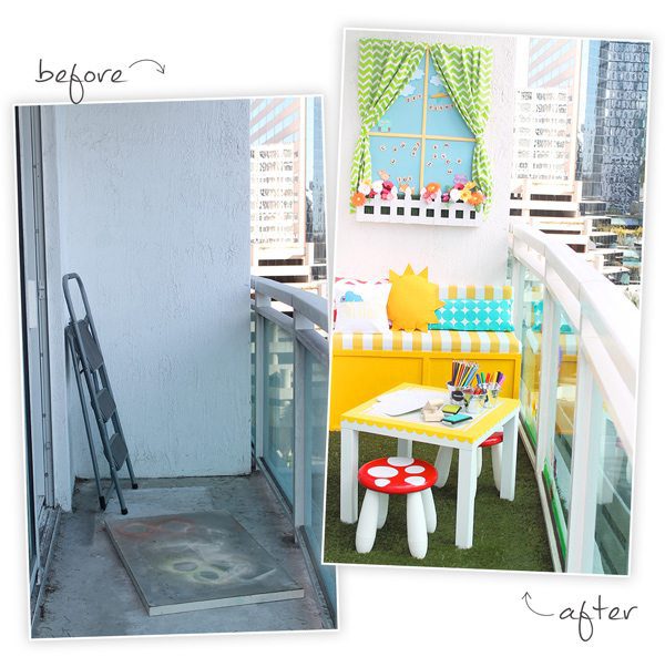 Downtown Miami is the land of balconies. Here, real estate is vertical and pretty much everyone lives in a condo or apartment which is why I used our balcony as an outdoor playroom. The upside is that it provides a really cute and unique setting for playing. Keep in mind, though, you’ll want adult supervision at all times to make sure the kiddos are safe. Thankfully, my handmade bench is perfectly sized for adult-sized butts to sit comfortably and hang out.