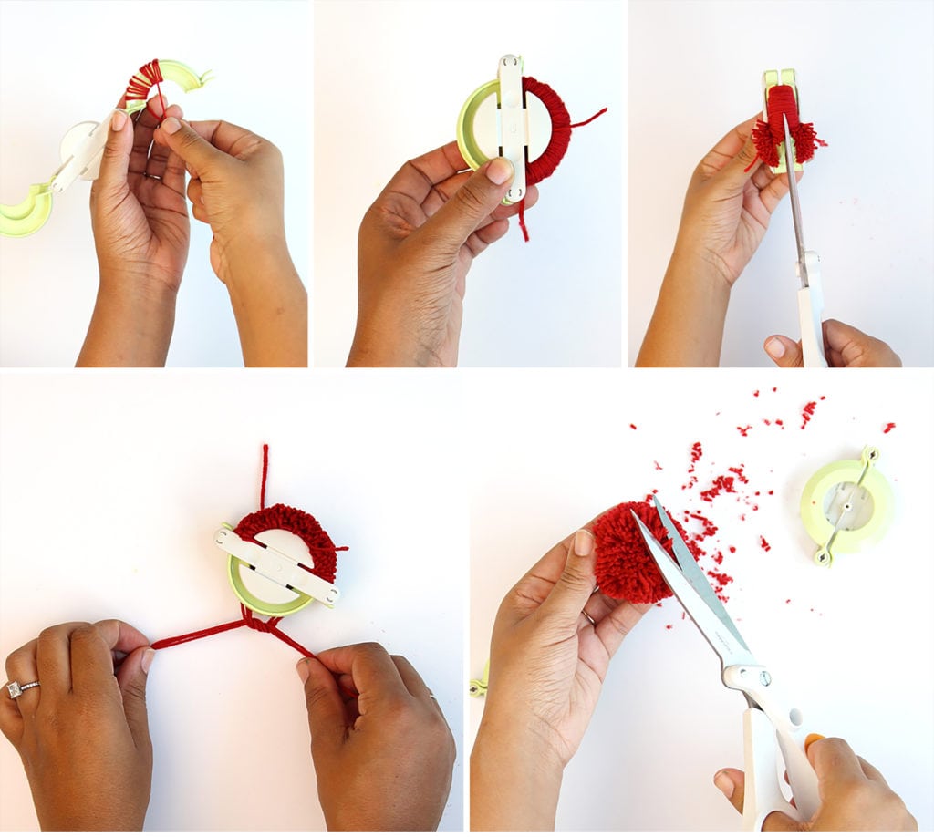 Make half pom poms by wrapping yarn around one half of the pom pom maker. Cut it as shown, tie it off them remove it from the pom pom maker and trim, trim, trim until you have a perfect little pom pom!